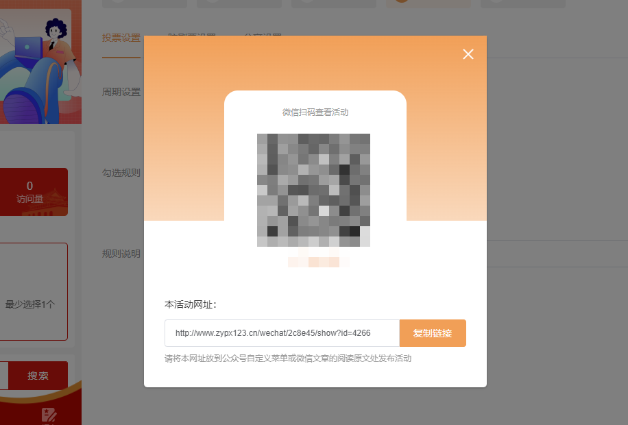 第七步,完成上面这些之后,直接点击【发布活动】,系统就能自动生成活动的链接和二维码。将其保存下来并分享出去,就可以让大家一起投票,选出最终的最佳运营。