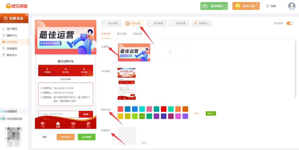 第四步,在【页面设置】里面,上传一张能够突出主题的轮播图封面,并根据封面的颜色,调整配色方案、更改背景图片等。