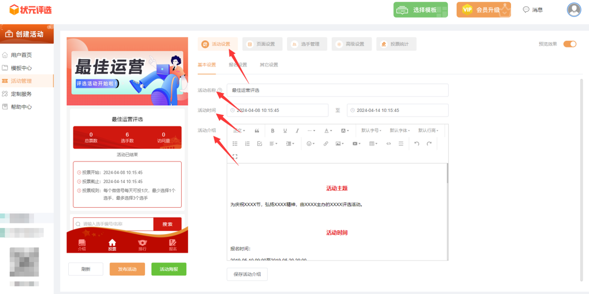 第三步,在【活动设置】里面,将活动名称改成最佳运营评选,并设置活动的时间和活动介绍。