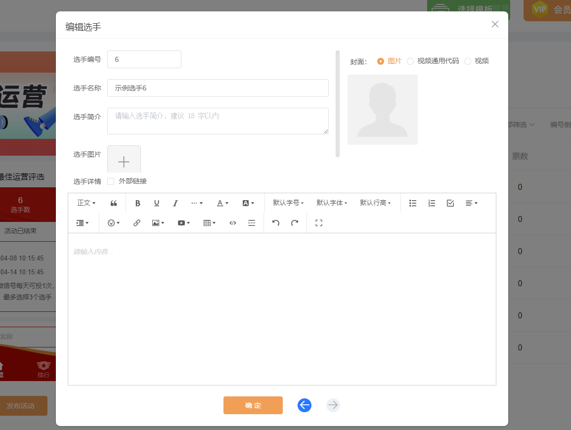 第五步,在【选手管理】里面,添加所有选手的个人资料,包括他们的名称、简介等。