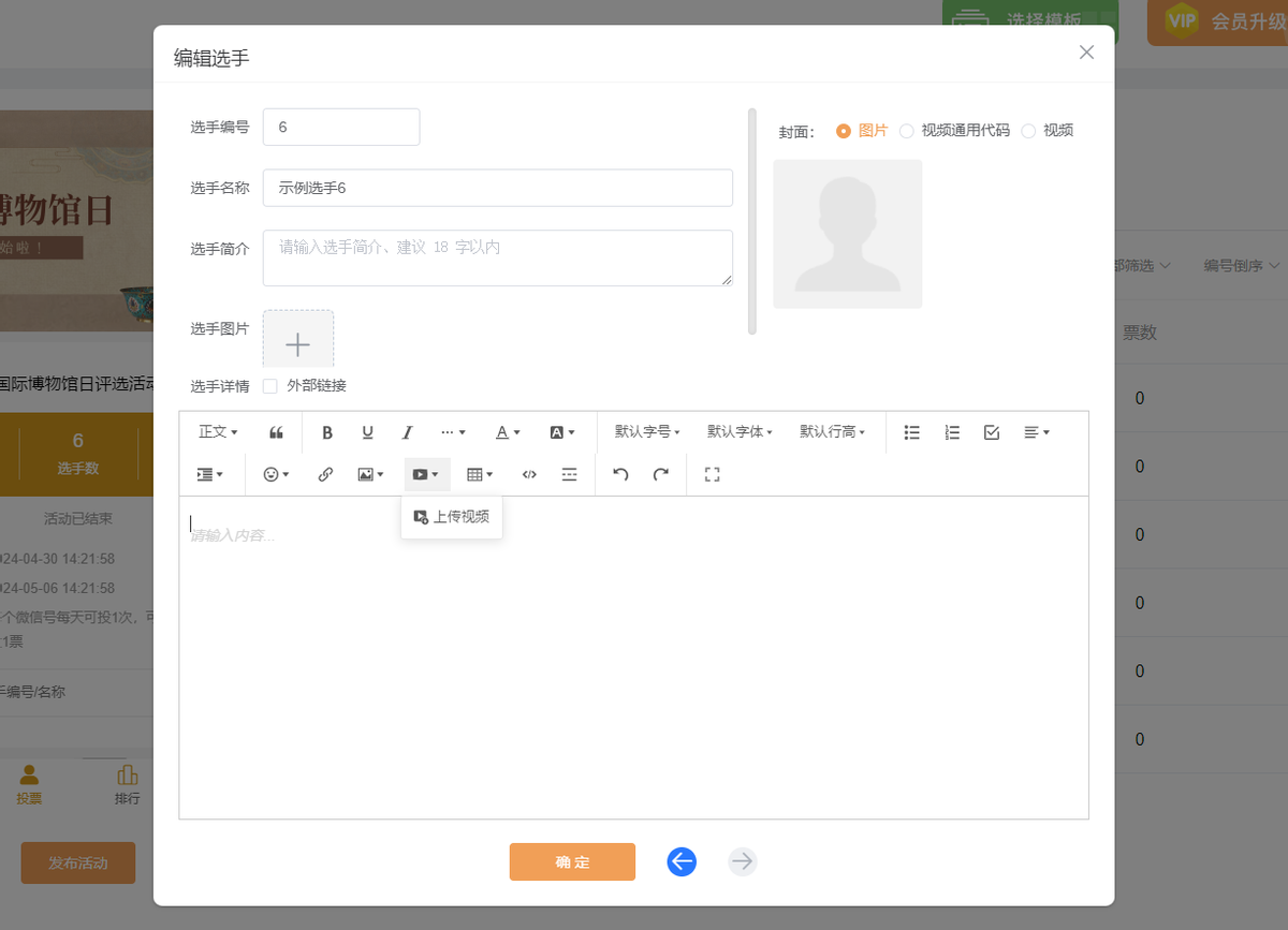 第五步,在【选手管理】里面,上传所有选手的个人资料,包括选手的名称、简介、照片等。