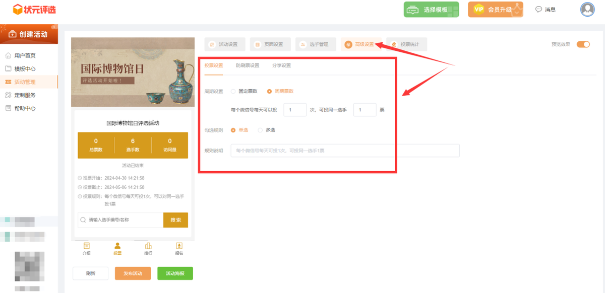 第六步,在【高级设置】里面,设置此次投票活动的规则。即在这一活动期间,可以给几名选手投票、投几票等。