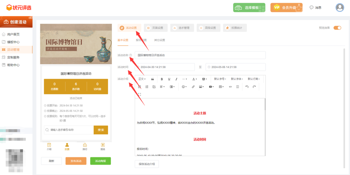 第三步,在【活动设置】里面,修改活动名称、设置活动时间、编辑活动介绍。