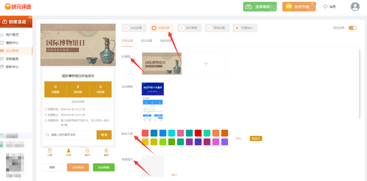 第四步,在【页面设置】里面,添加一张能够突出主题的轮播图封面,并根据封面的颜色,调整配色方案和更换背景图片等。