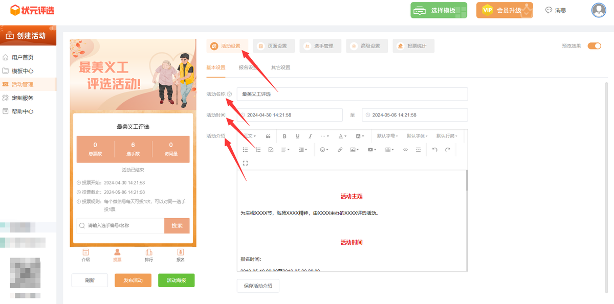 第二步,在【活动设置】里面,将活动名称改成最美义工,设置活动开始和结束的时间,编辑活动介绍内容。