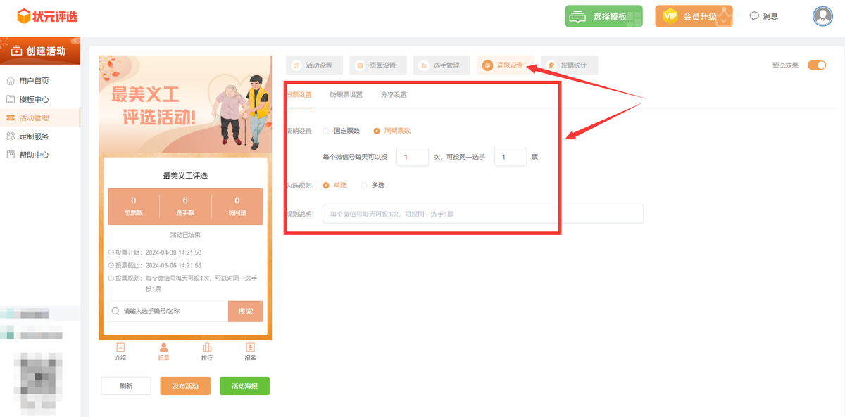 第五步,在【高级设置】里面,设置此次投票活动的活动规则,包括投票方式(如每个用户媒体可以投多少次)、投票周期(如每天还是整个活动期间)、投票限制(如每次最多可以选择几名选手)等。