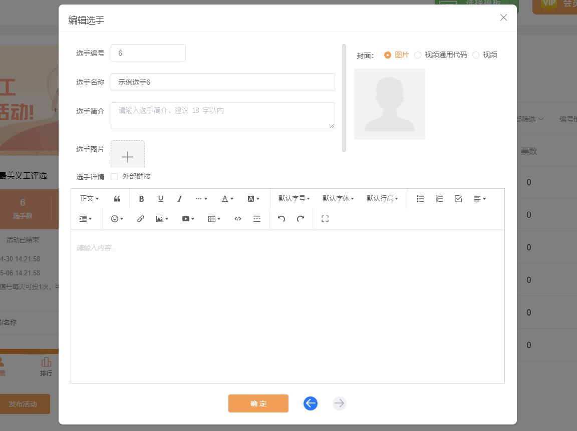 第四步,在【选手管理】里面,上传所有选手的个人资料,包括选手的名称、简介、照片等信息。