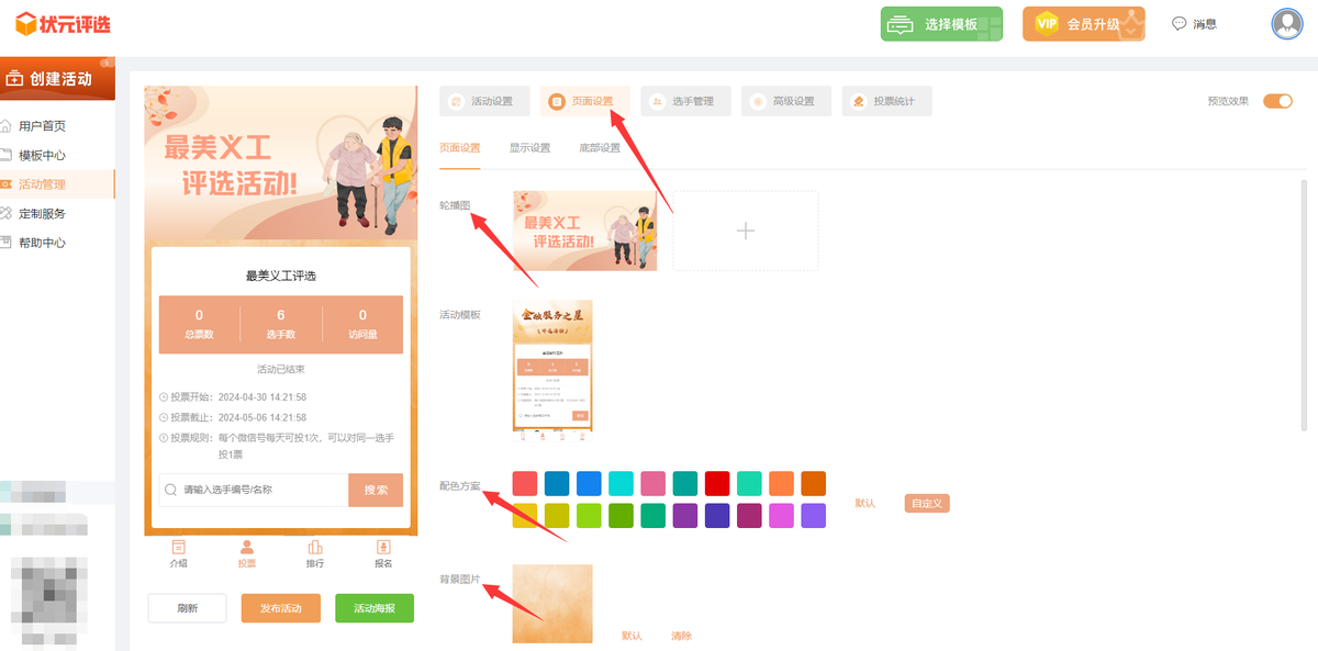 第六步,上面这些都做完之后,检查一下,如果没有问题的话,直接点击【发布活动】,系统能够自动生成活动的链接和二维码。这样最美义工微信投票活动就已经制作完成了,是不是很简单?