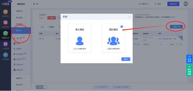 - 点击“新建摇一摇”选择“团队模式”并进行游戏轮次设置
