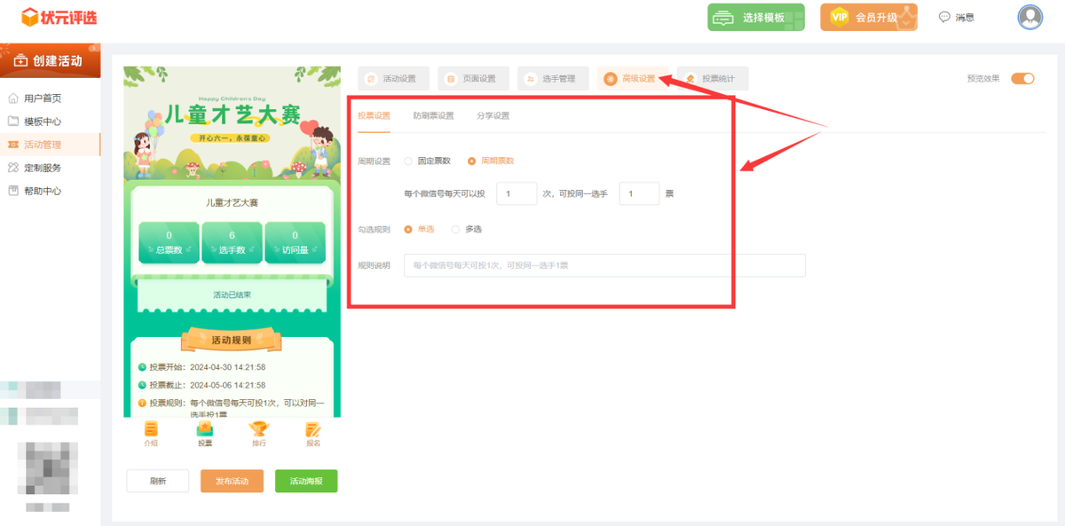 再然后,在【高级设置】中,设置投票活动的规则。