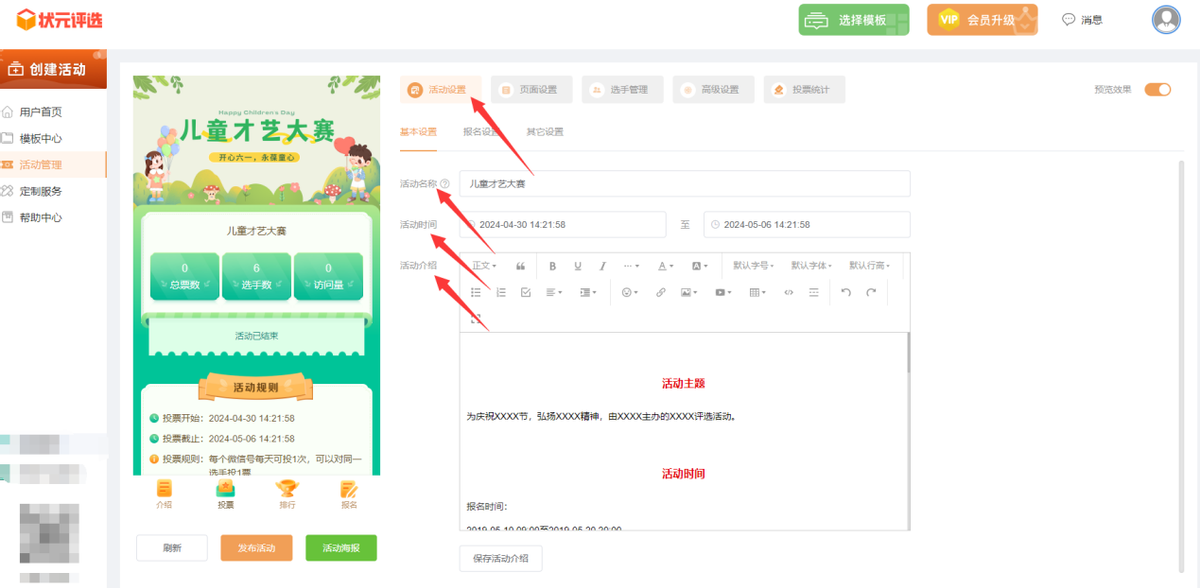 其次,在【活动设置】里面,修改活动名称、设置活动时间、编辑活动介绍。