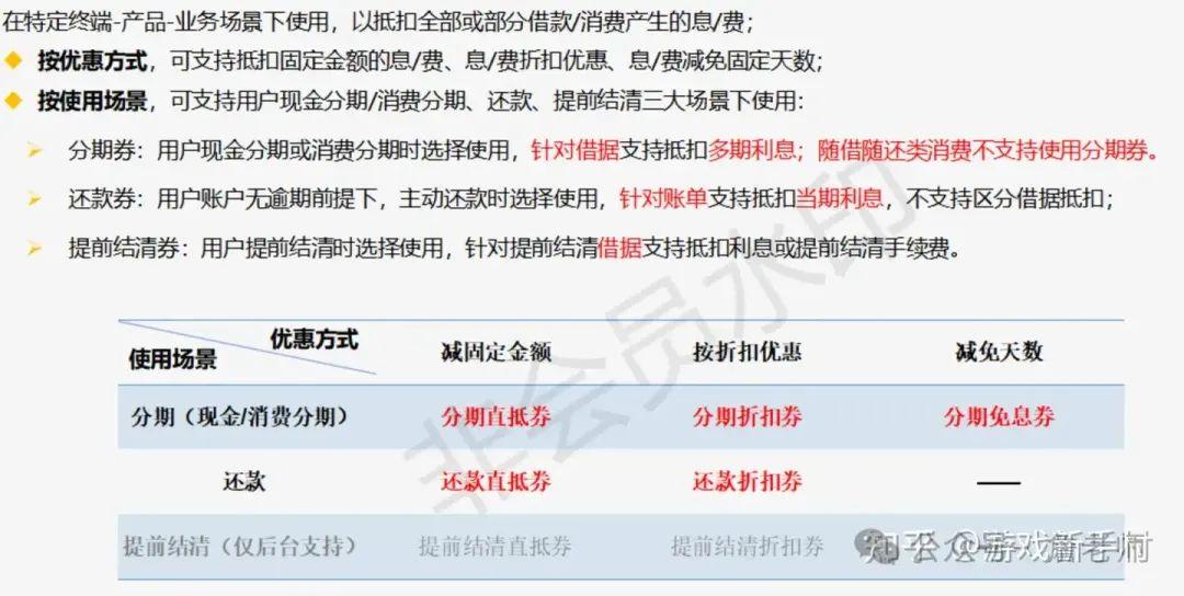 下图是某金融产品的优惠券,按使用场景和优惠方式可以分为7类(不同的金融产品和公司还会有差异,比如唯品会金融优惠券就和下图的金融优惠券有较大的差异)。