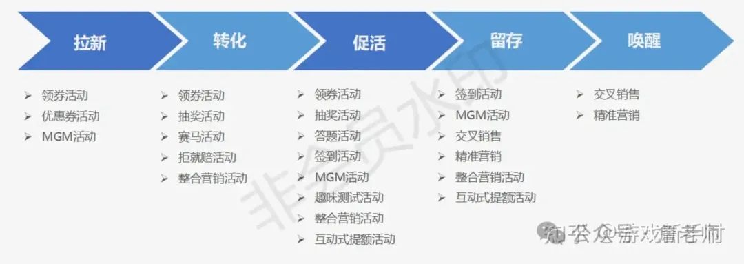 以下是早些年我在马上消费金融做营销活动产品时梳理的营销活动玩法,我是按照用户所处的生命周期阶段来设计对应的营销活动玩法。