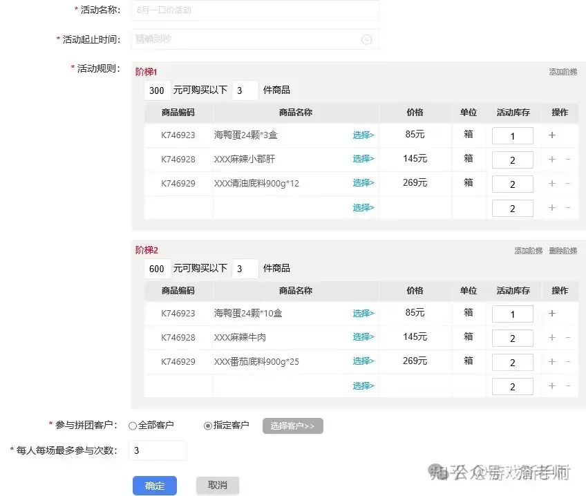 - 为了提高成团几率,可以在老带新拼团的模式上设置老客拼团价和新客拼团价,新老客的判断标准和逻辑可以根据平台和行业的性质类确定,有些是无任何购买记录的视为新客,有些则是N天内无购买的视为新客。