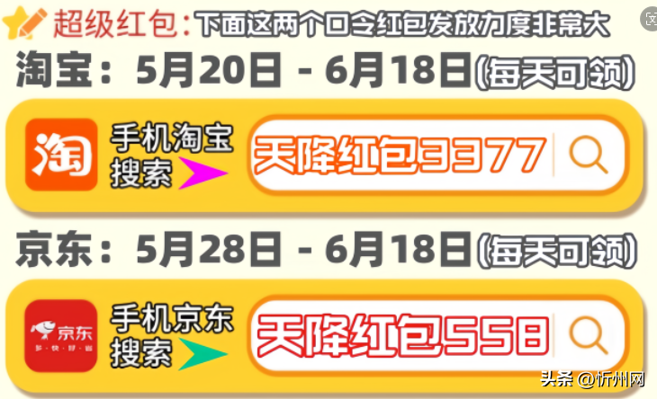 首先,划重点!今年的淘宝618红包口令是「天降红包3377」,京东的618红包口令是「天降红包558」记得每天去领,因为领的红包大小和你搜索的什么口令有关哦!