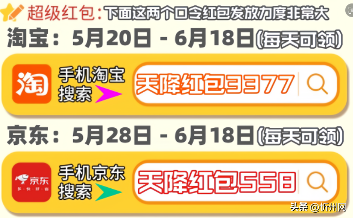 - 划重点!今年的淘宝618红包口令是「天降红包3377」,京东的618红包口令是「天降红包558」记得每天去领,因为领的红包大小和你搜索的什么口令有关哦!