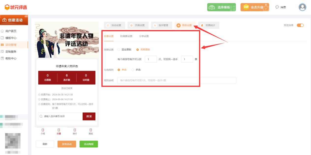 第五步,点击进入到【高级设置】里面,设置此次投票活动的规则。