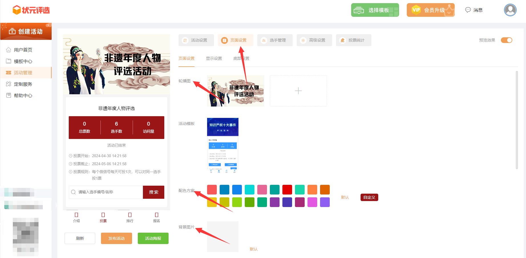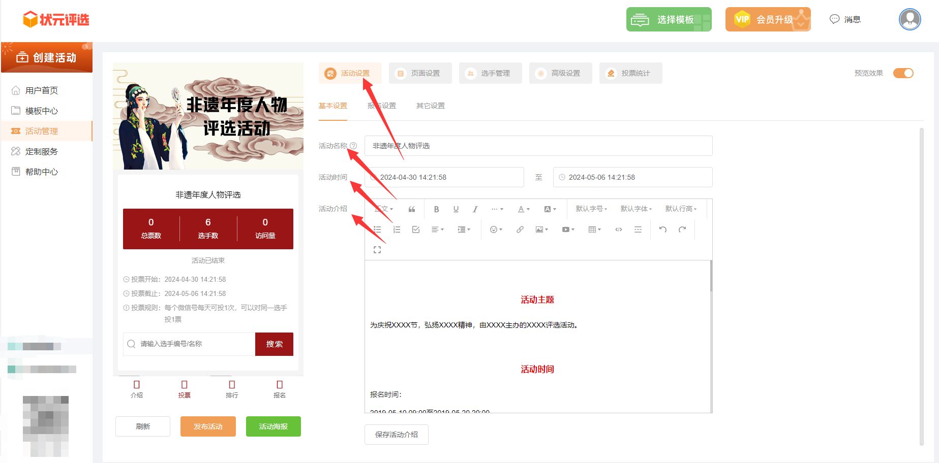 第二步,点击进入到【活动设置】里面,将活动名称改成非遗年度人物评选,并设置活动开始和结束的时间,以及活动介绍内容。
