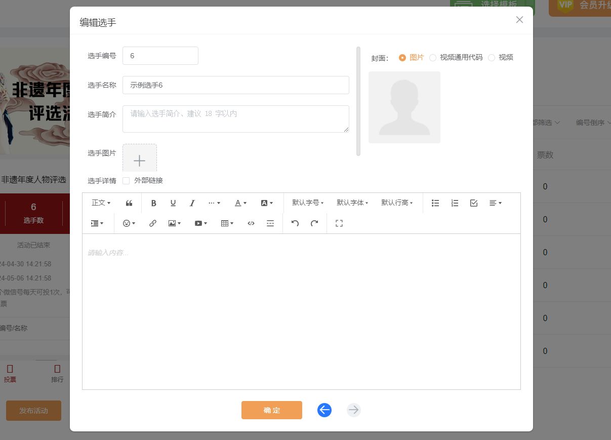 第四步,点击进入到【选手管理】里面,将所有选手的个人资料都上传,包括他们的名称、简介、照片等。