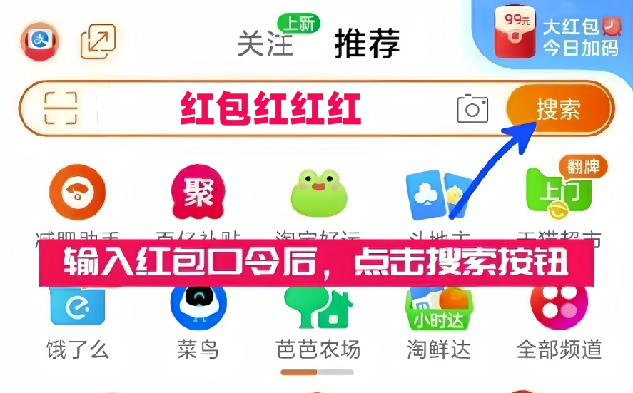 2024年淘宝天猫618红包领取口令是「 红包红红红 」在活动时间内,每天打开淘宝或天猫APP,搜索框内输入618红包领取口令「 红包红红红 」搜索即可进入2024年淘宝天猫618官方活动入口,每天可领取1次,最高可得24888超级红包。