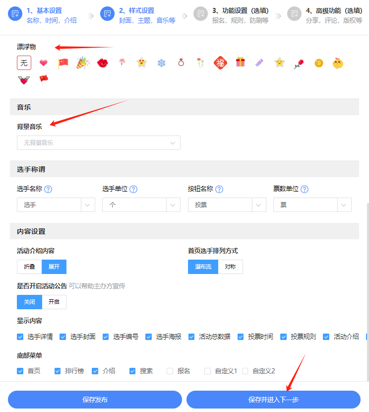3.上传活动封面和背景图,或者在系统中选择(平台海量免费封面模板任意选择),设置一个符合活动主题的皮肤样式,添加背景音乐、漂浮物。