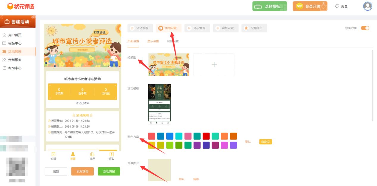 再者,点击进入到【页面设置】里面,上传一张主题轮播图,并根据轮播图的颜色,来调整配色方案、更换背景图片等等。