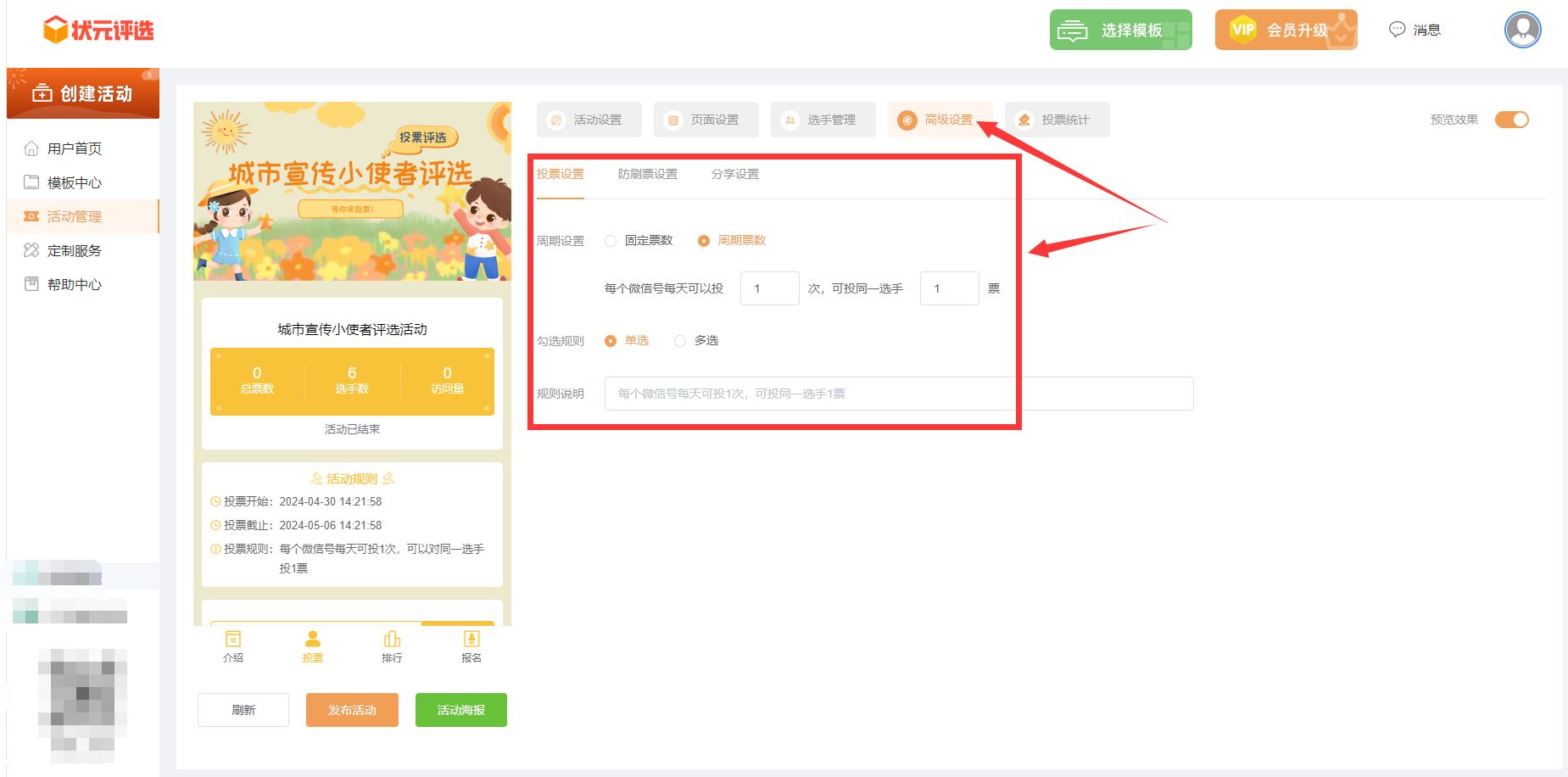 再然后,点击进入到【高级设置】里面,完成投票活动规则的设置。