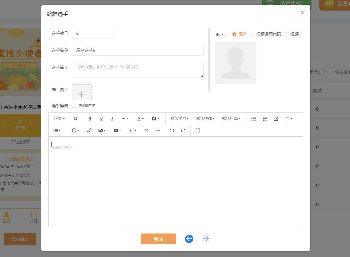 然后,点击进入到【选手管理】里面,上传所有选手的个人资料,包括选手的名称、简介等。
