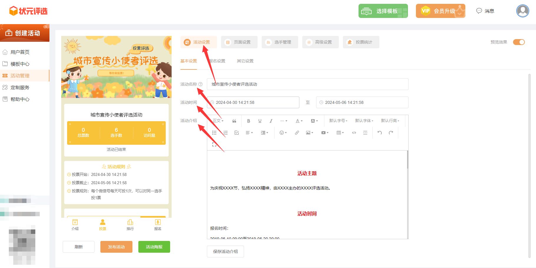 其次,点击进入到【活动设置】里面,将活动名称改成城市宣传小使者微信评选活动,并设置活动开始和结束的时间,以及编辑活动介绍内容。
