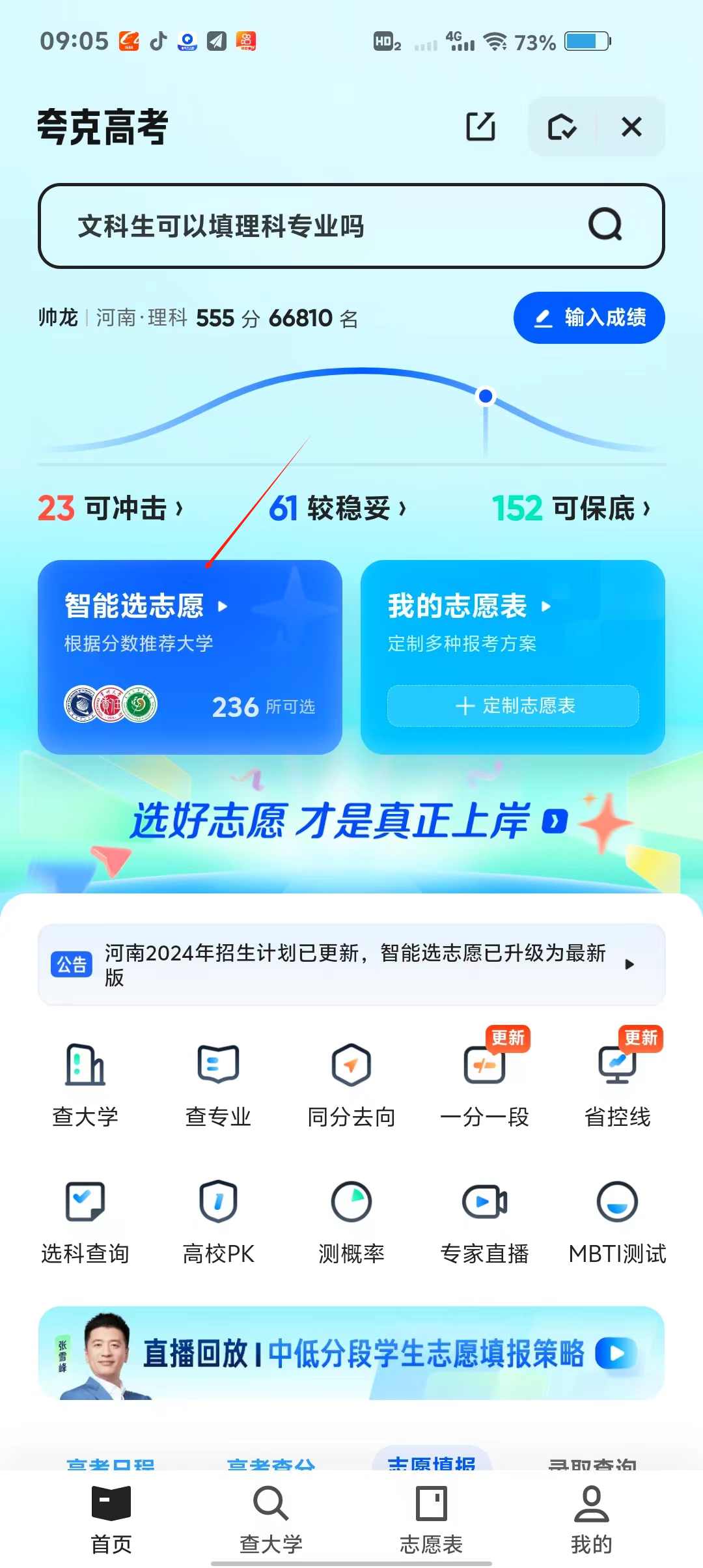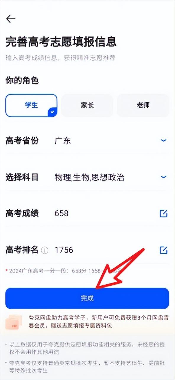 填报信息随便填,选择角色、省份、科目、高考成绩,最后点击完成