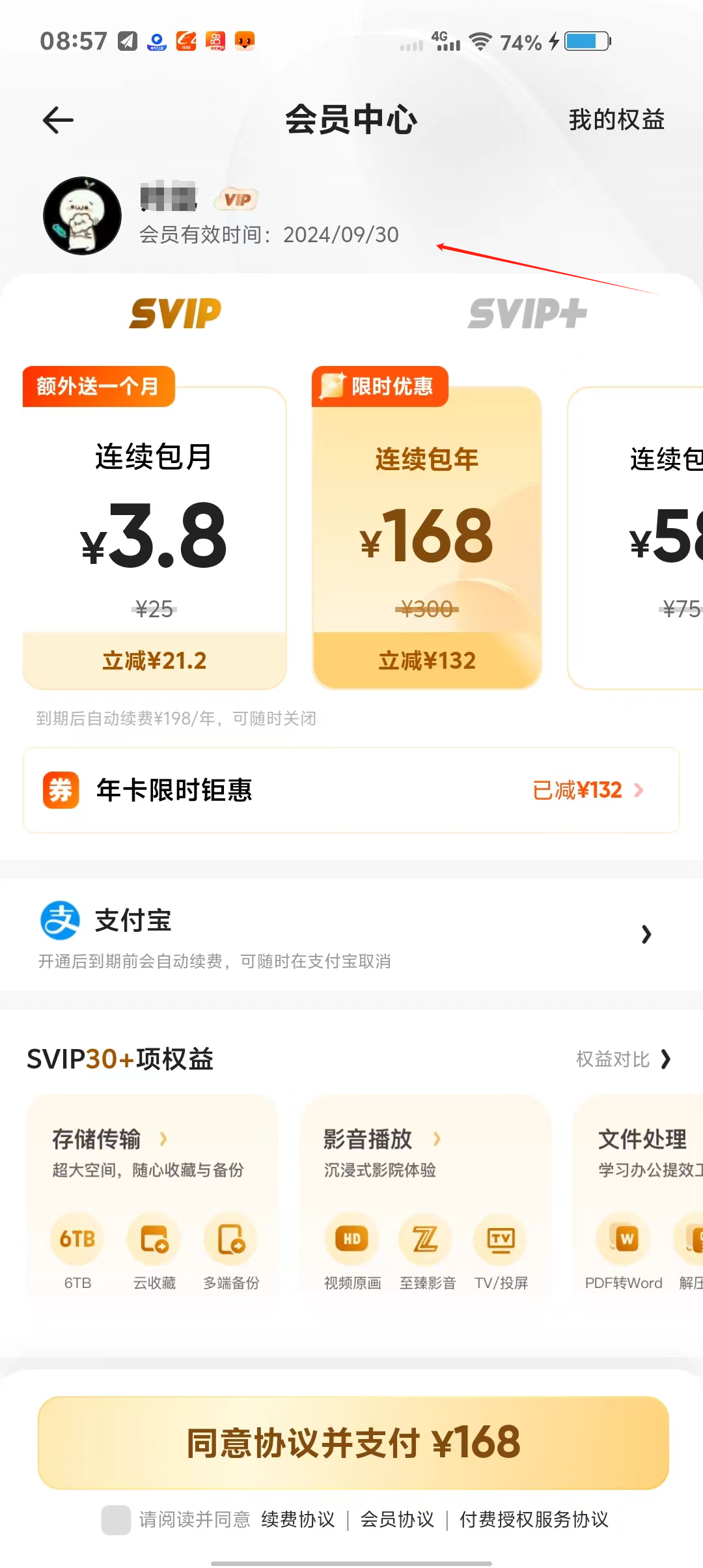 填完以后进入“我的权益”里能够看到三个月的会员了,并且有 3T 的可用空间,完全无需任何复杂的操作就能领取。
