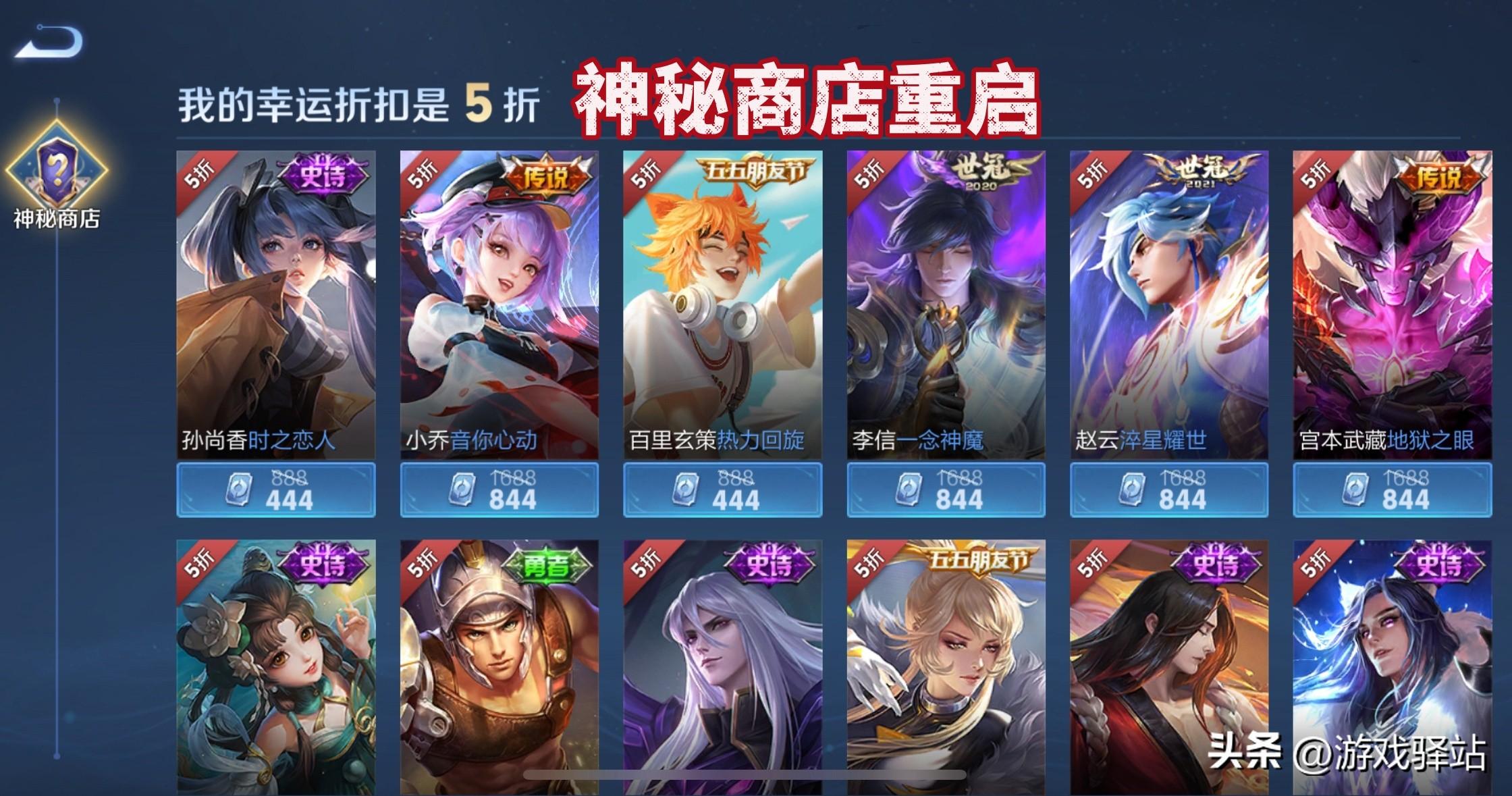 五、神秘商店,与以往一样,也是4款传说+16款史诗供玩家选择,当然玩家参与的前提是拿到半价,毕竟达到844传说和444史诗才能省下更多点券,这也是为什么非限定传说或史诗上架后,玩家没有第一时间入手的主要原因,预计这次会返场镜炽阳神光、达摩黄金狮子座、王昭君乞巧织情等传说,而史诗皮肤依旧是选择未加入碎片商店的类型,比如瑶遇见神鹿、钟馗乐园奇幻夜、司马懿暗渊魔法等。