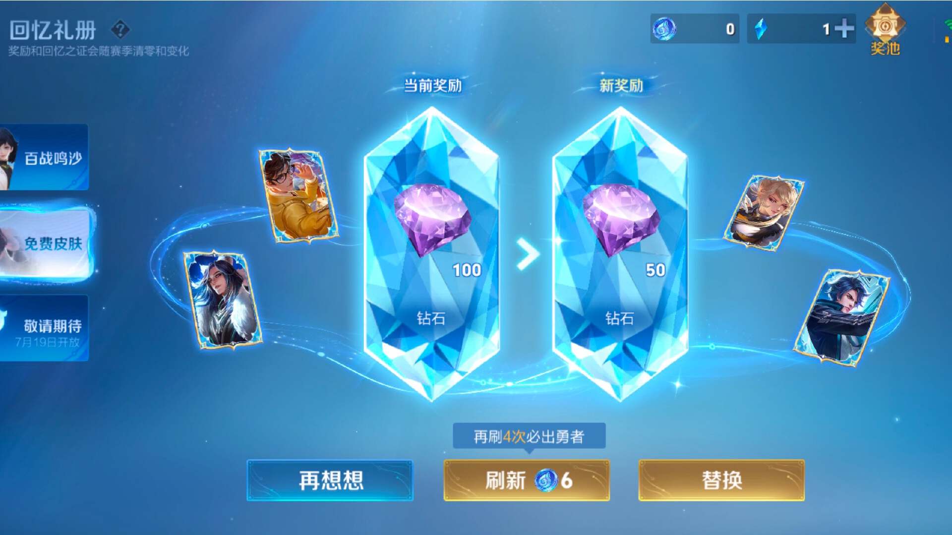 利用回忆之证,即可刷新免费皮肤,刚开始会刷出钻石或者亲密玫瑰,随着刷新次数越来越多,刷出皮肤的概率也会越来越大。在第61次刷新的时候,必定会刷出一款免费的史诗皮肤。