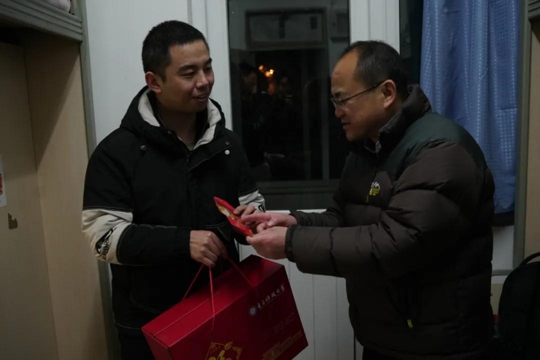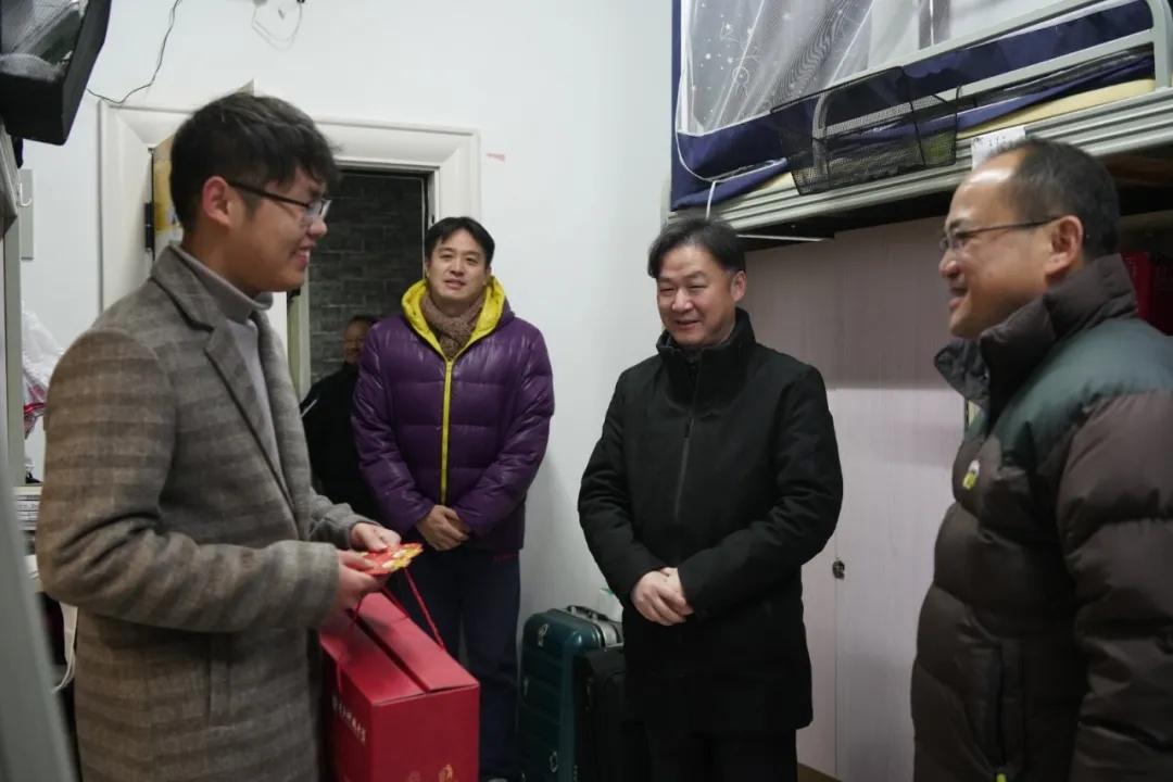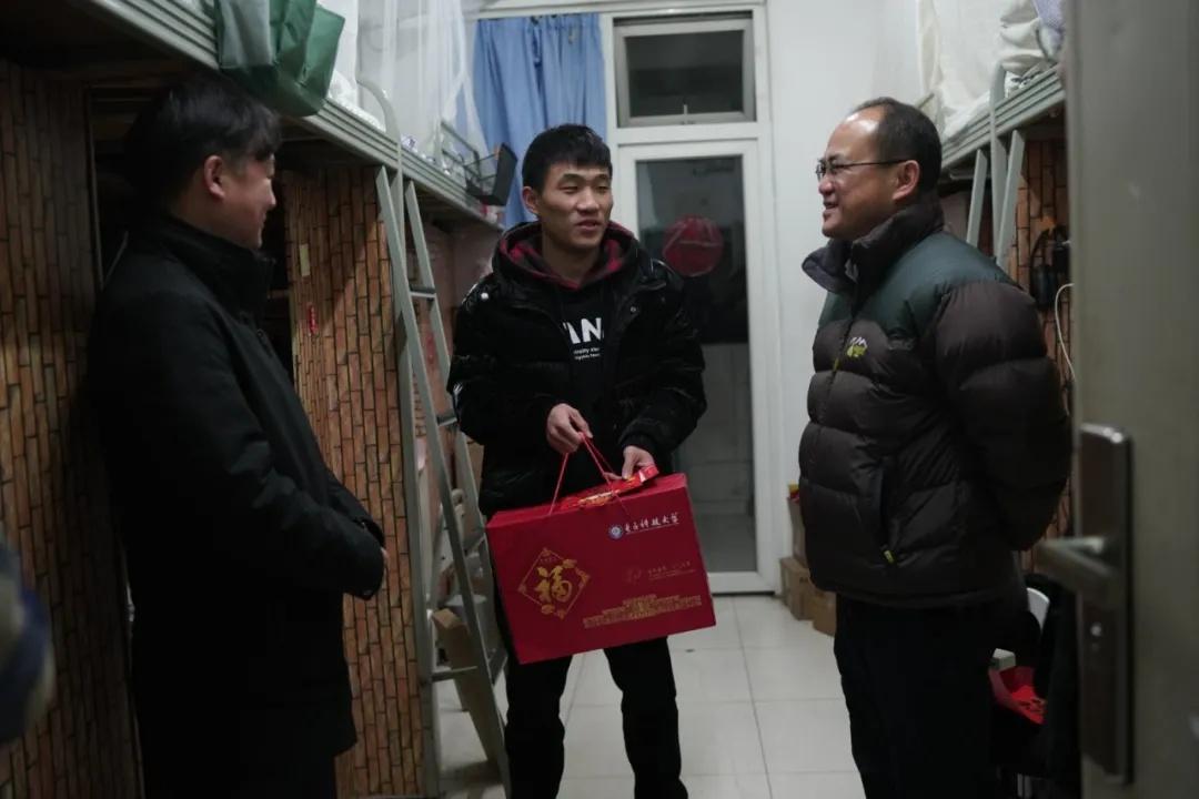 校领导看望慰问了宿管阿姨,代表学校感谢大家在平凡的岗位上兢兢业业、辛勤付出,让同学们在寒假期间依然能够享受到生活的便利、感受到家一样的温暖;看望慰问了校医院、后勤保障部一线员工和安保队员并送上新年大礼包,感谢他们的辛勤付出,祝福大家新春快乐。