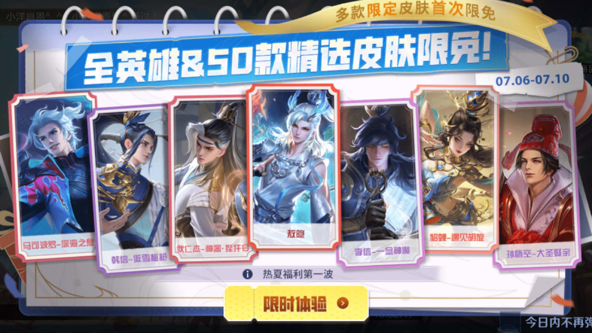 在6号到10号这段时间,官方开启了50款皮肤的免费体验活动,这50款皮肤全部都是热门英雄的皮肤,比如马可波罗、韩信、猴子、孙尚香貂蝉这些英雄等等。