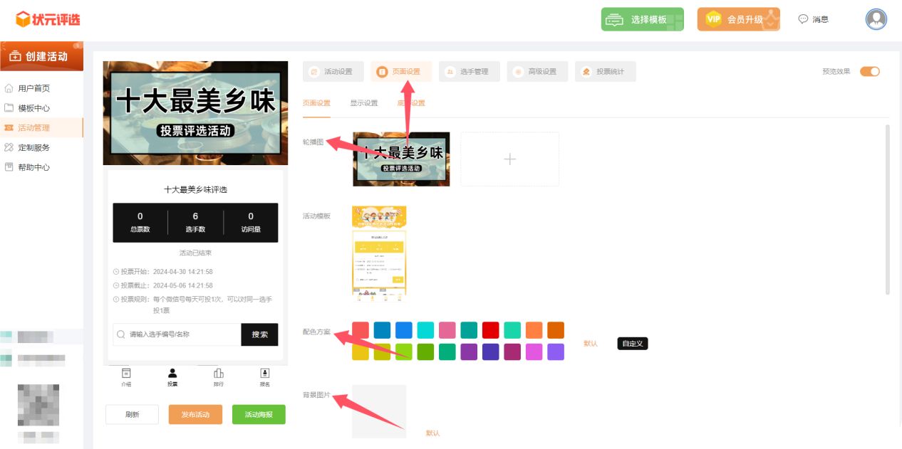 第三步,点击进入到【页面设置】里面,上传一张主题轮播图,并根据轮播图的颜色,来调整配色方案、更换背景图片等。