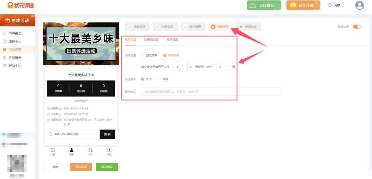 第五步,点击进入到【高级设置】里面,设置此次投票活动的规则。