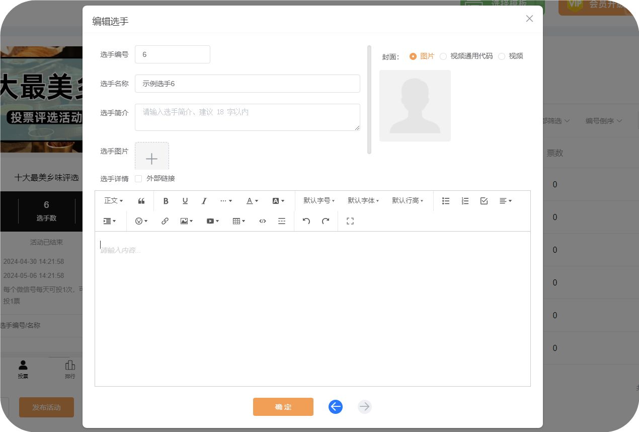 第四步,点击进入到【选手管理】里面,上传所有选手的个人资料,包括他们的名称、简介、照片等。