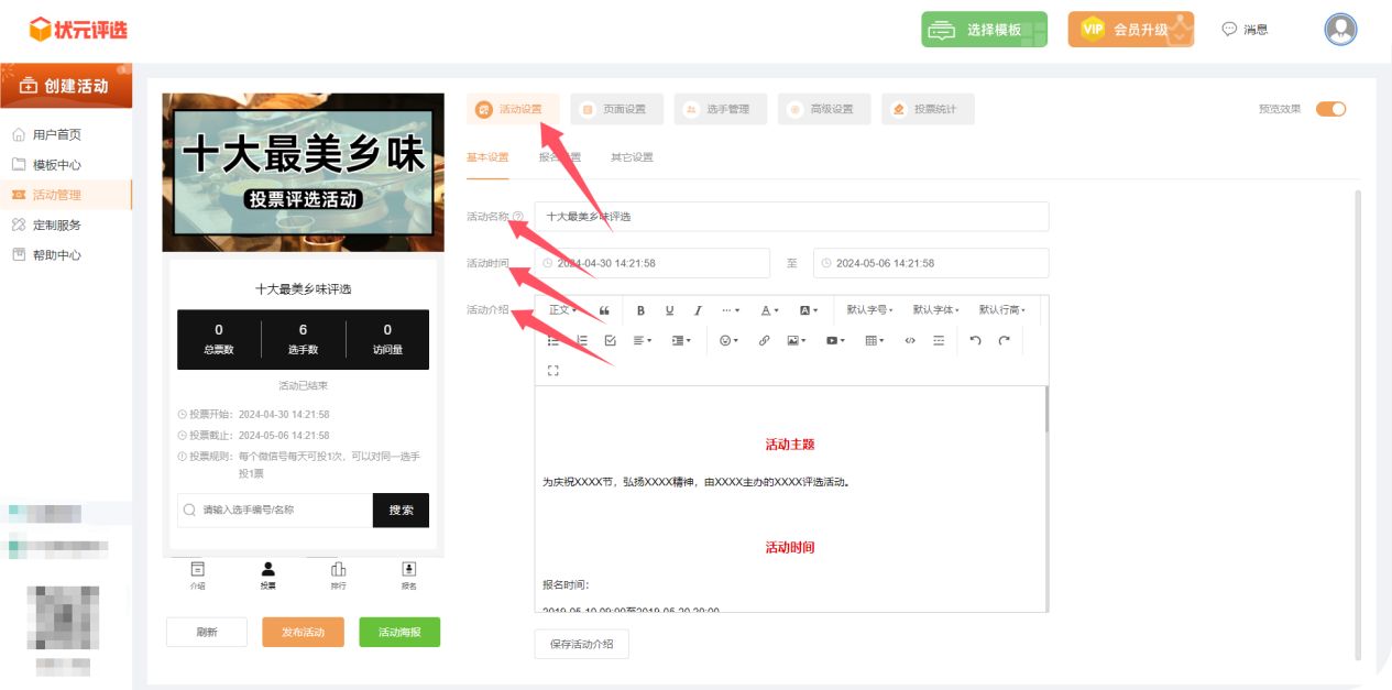 第二步,点击进入到【活动设置】里面,修改活动名称、设置活动时间、编辑活动介绍。
