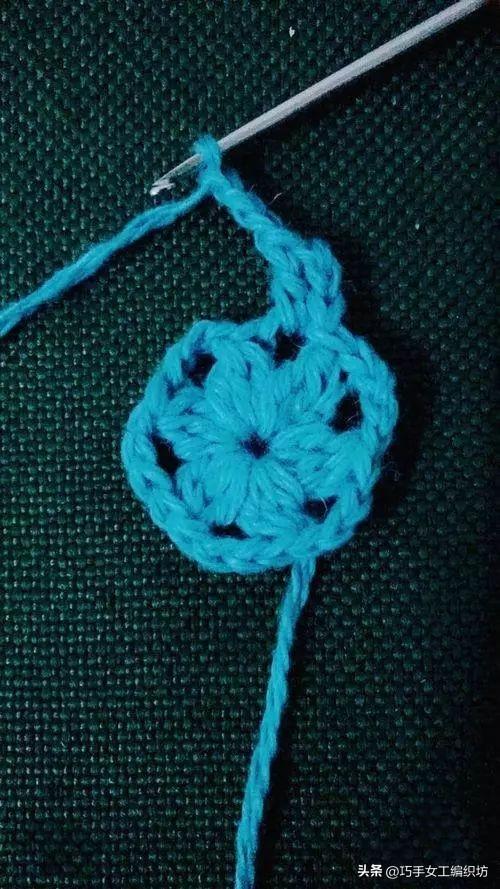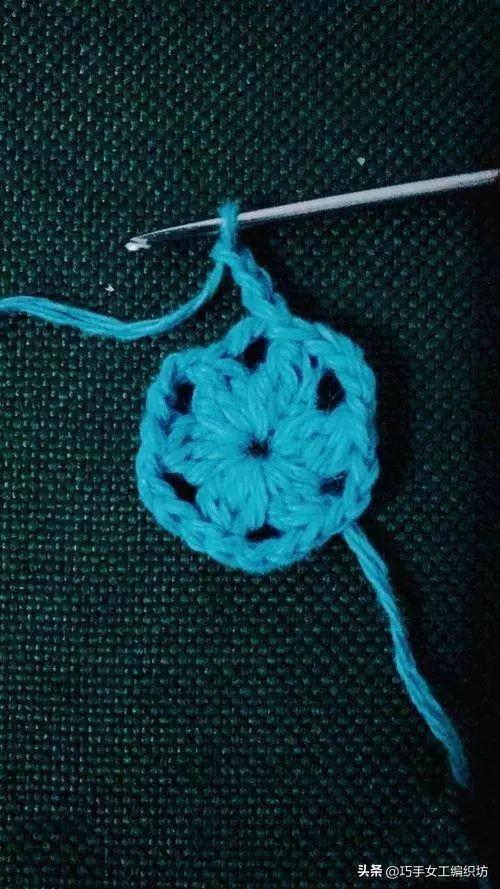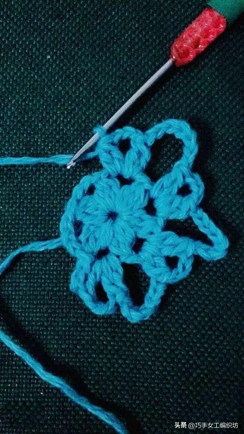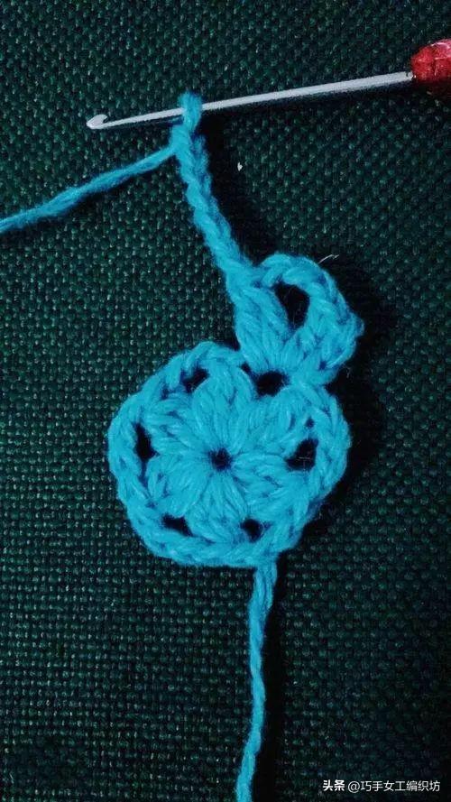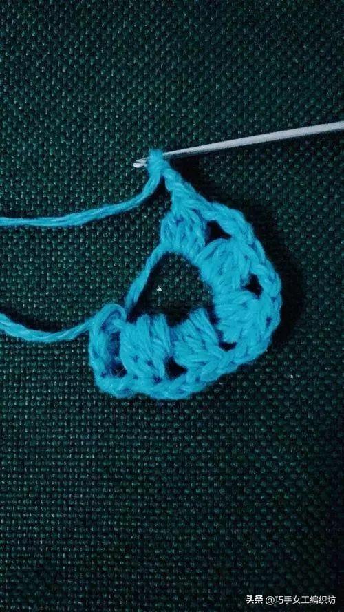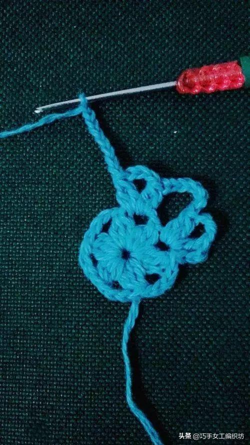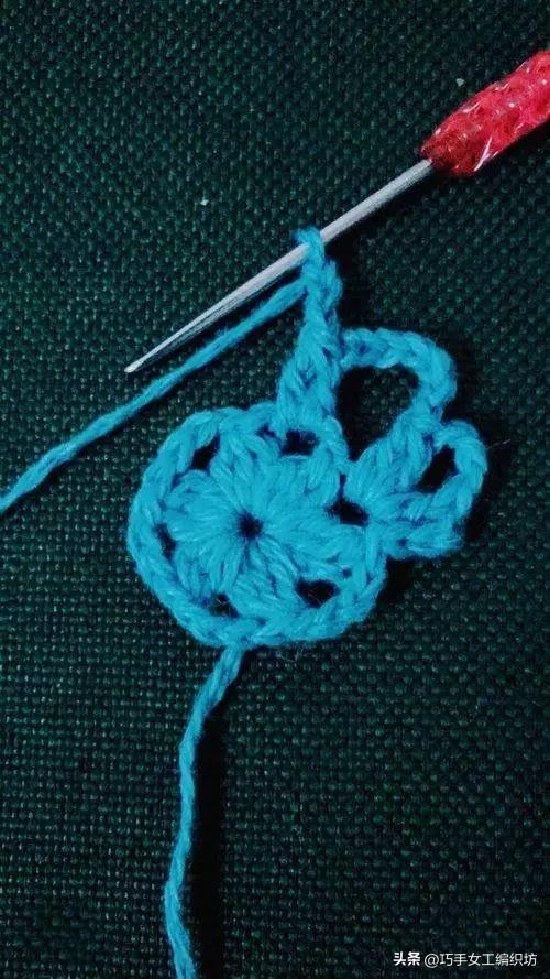 3.拉花3针,在花孔里面钩中长针1针,紧锁成1针,拉花3针,钩中长针2针,紧锁成1针,拉花7针。