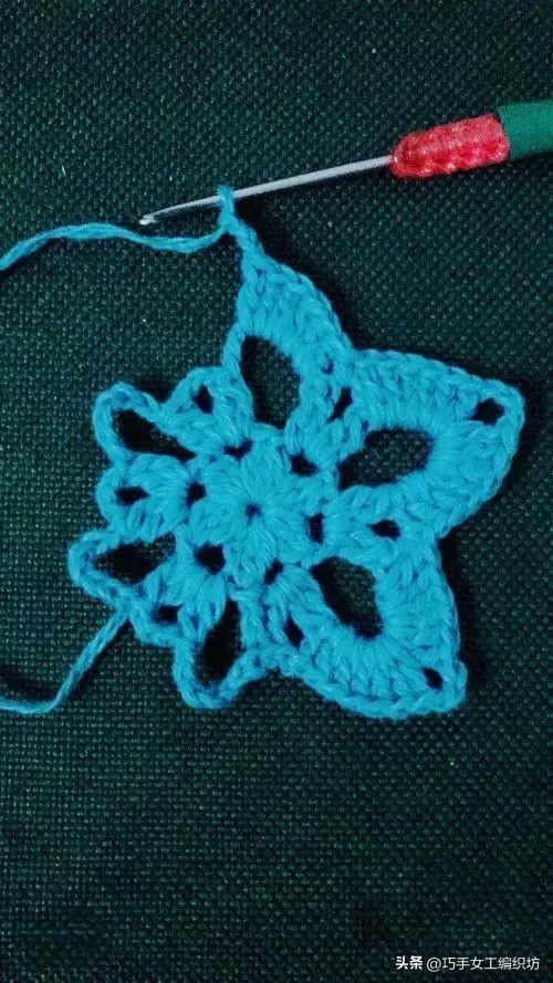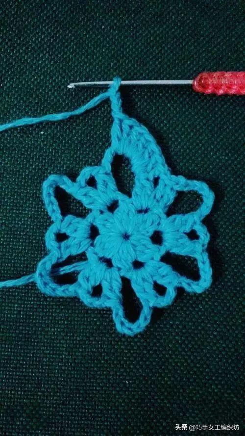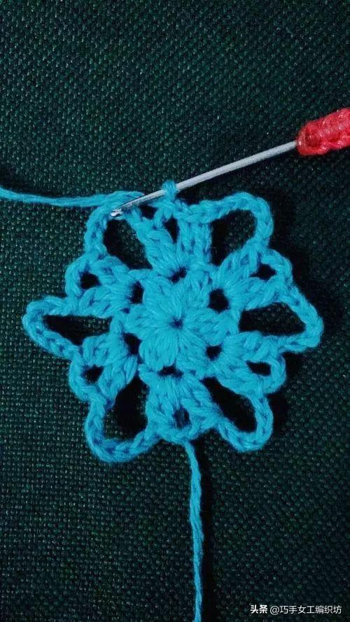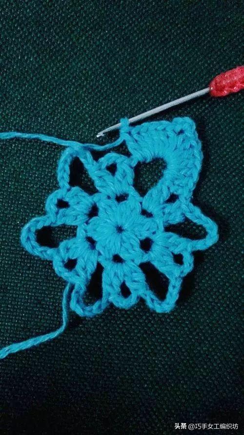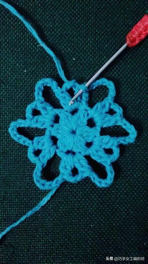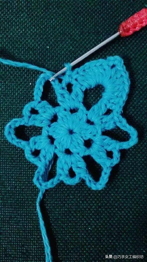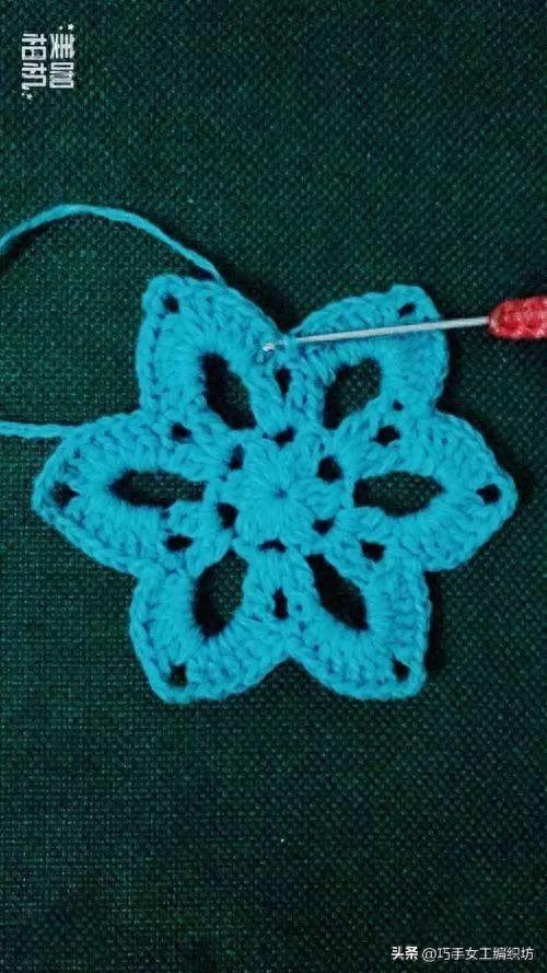 6.在下一个大的花孔里面下针,钩中长针6针,拉花3针。钩中长针6针,紧锁到小花孔顶端。按此步骤钩5次,完成1圈,这样一个六瓣花花样就编织完成了。