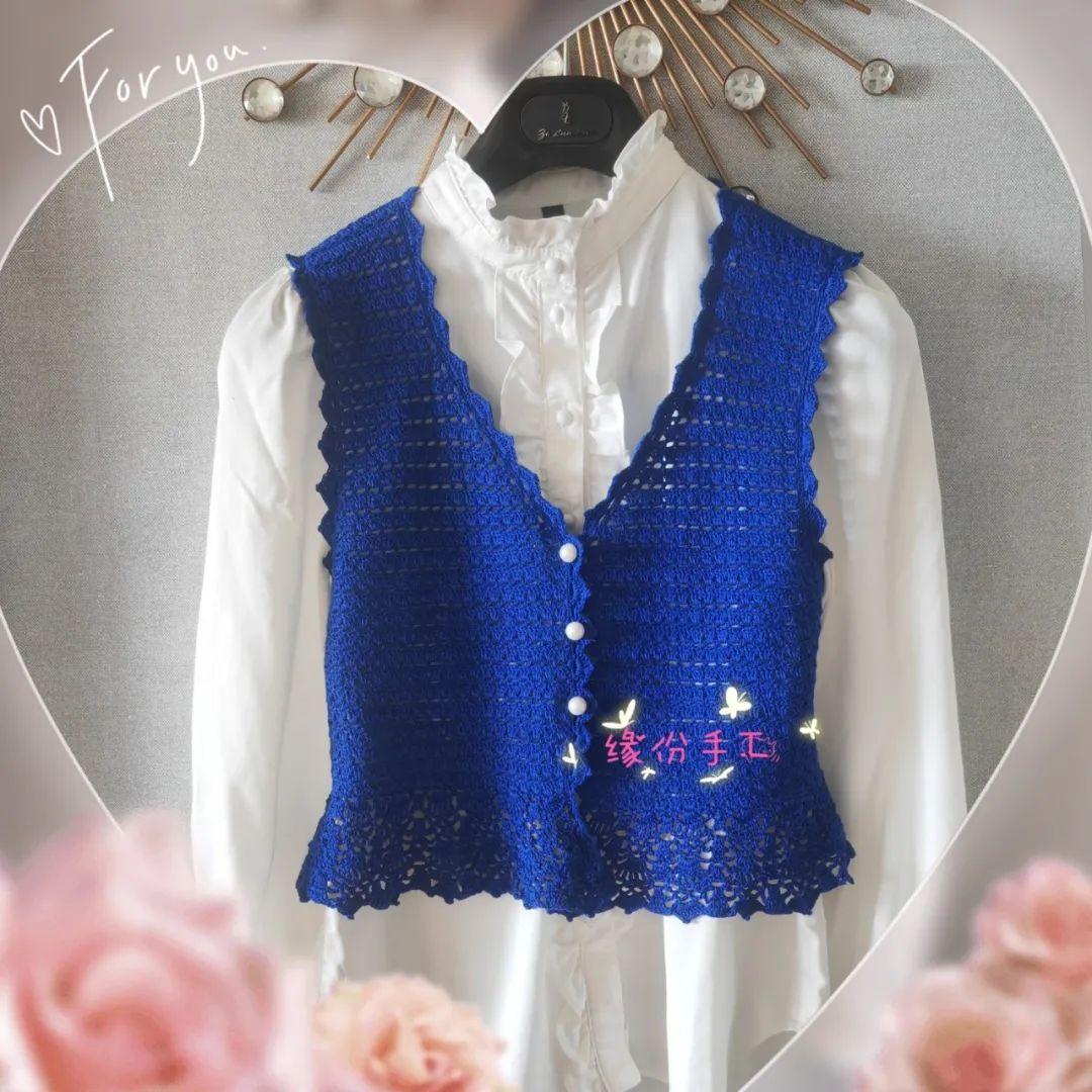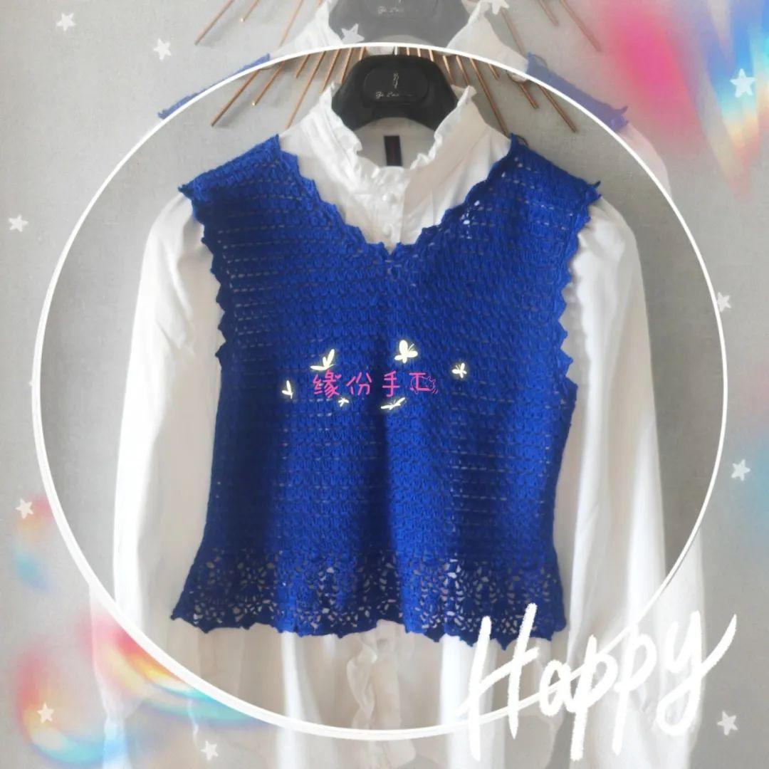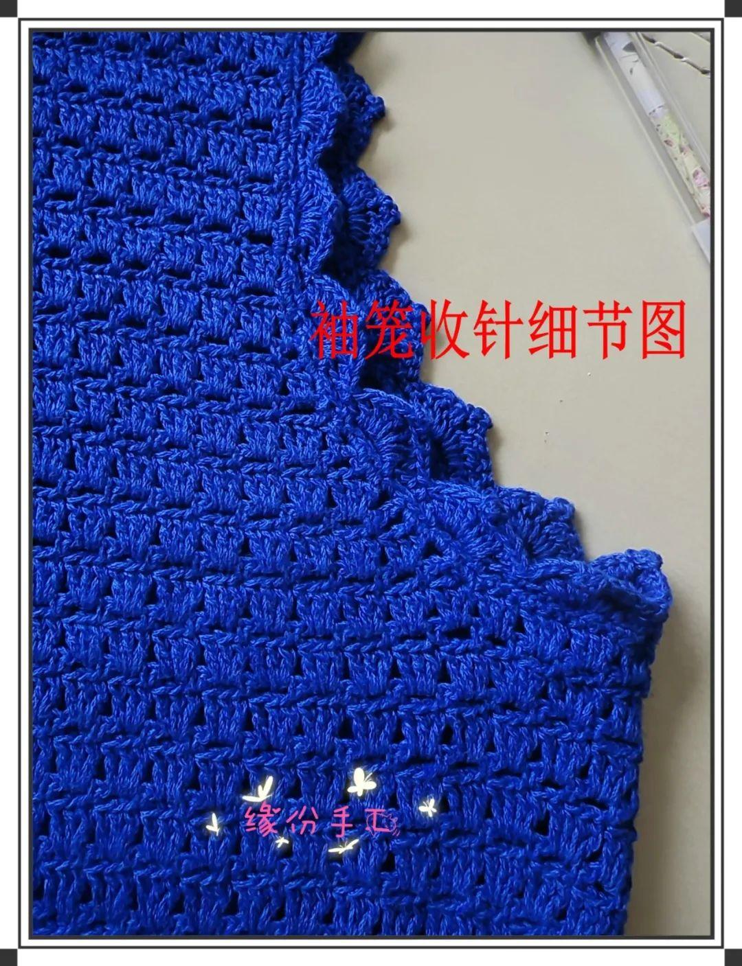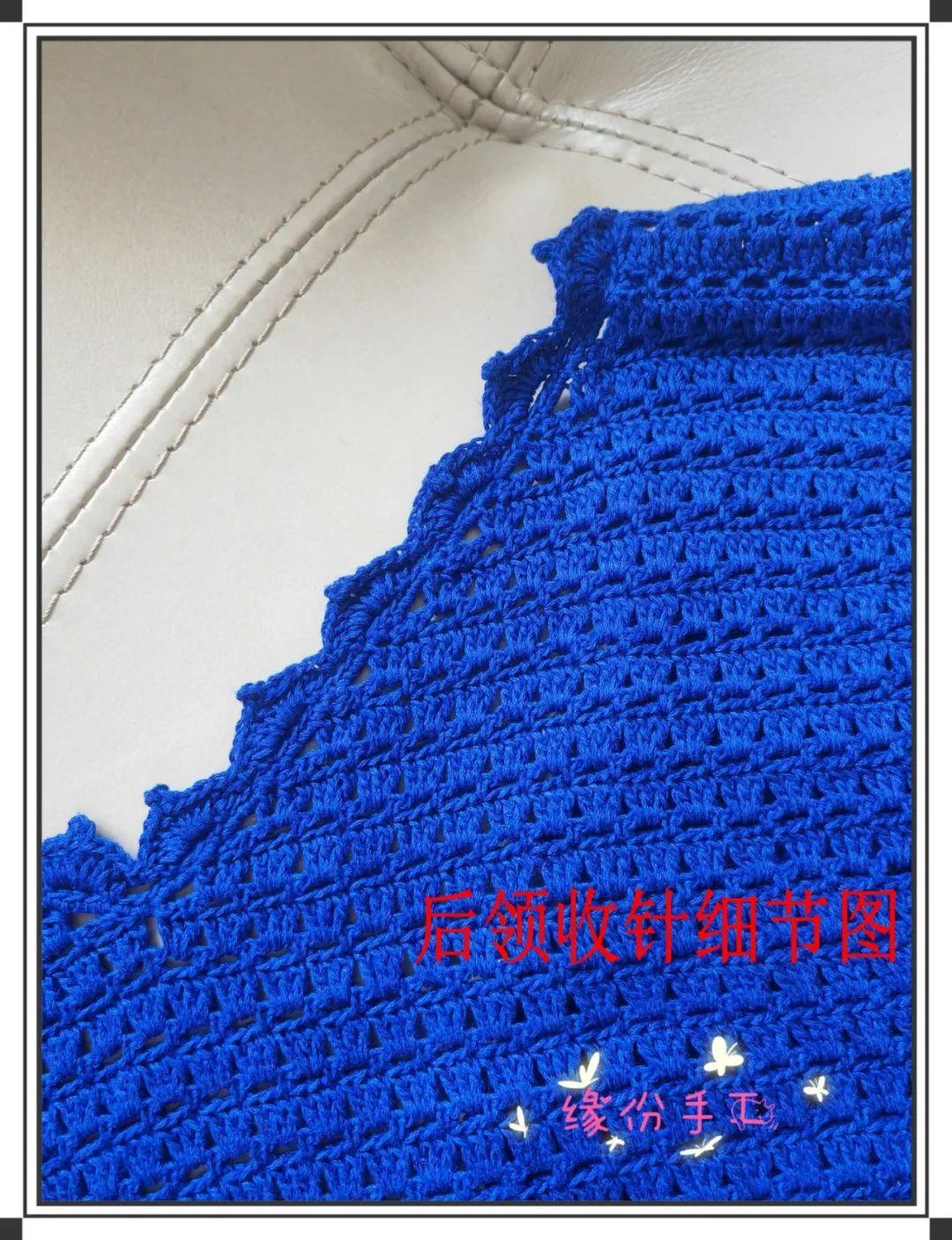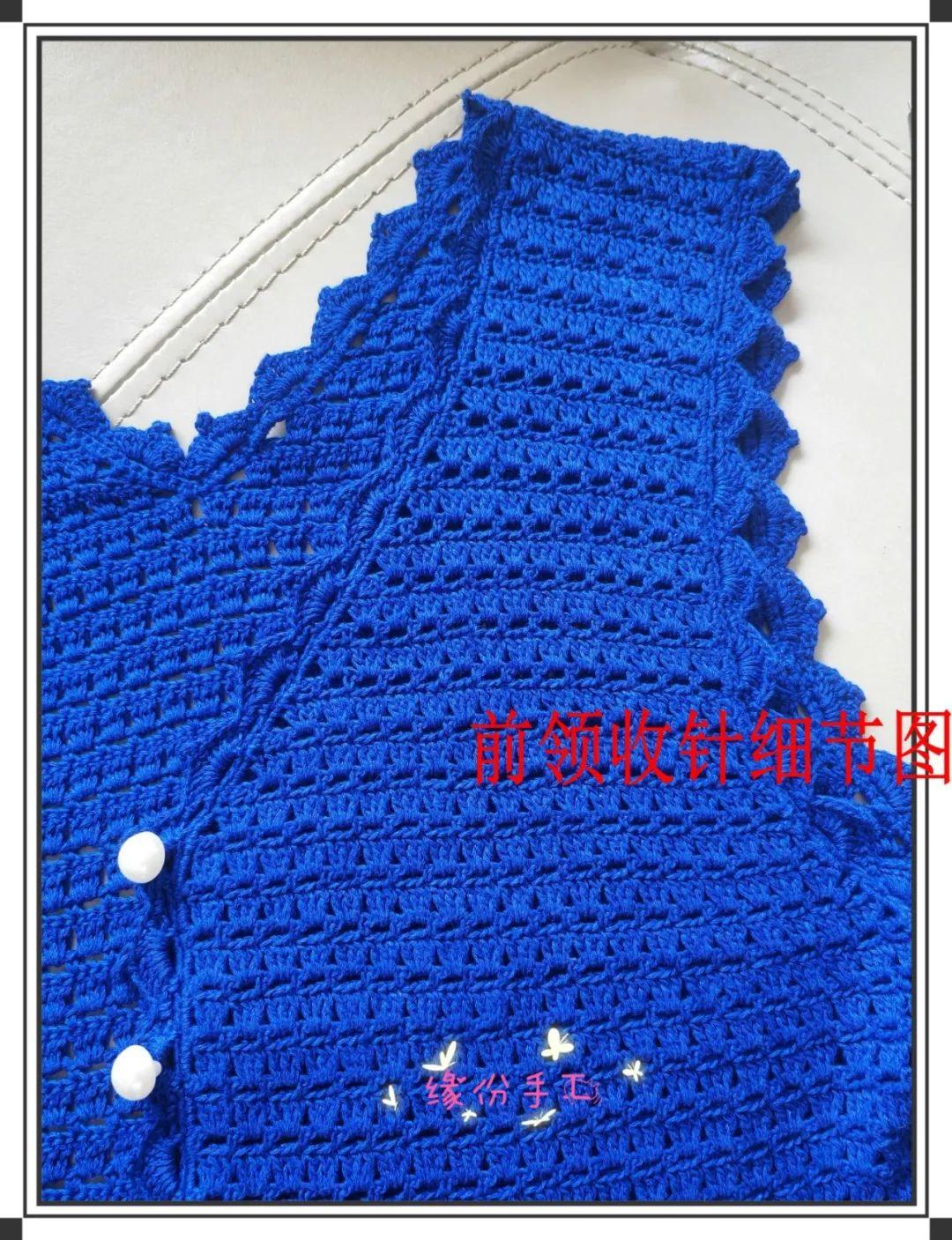前片:袖笼同后片一样收针,钩完第3组花后开始收前领,每一组花收掉一个花样,余8组花样后不加不减钩与后片一样长。