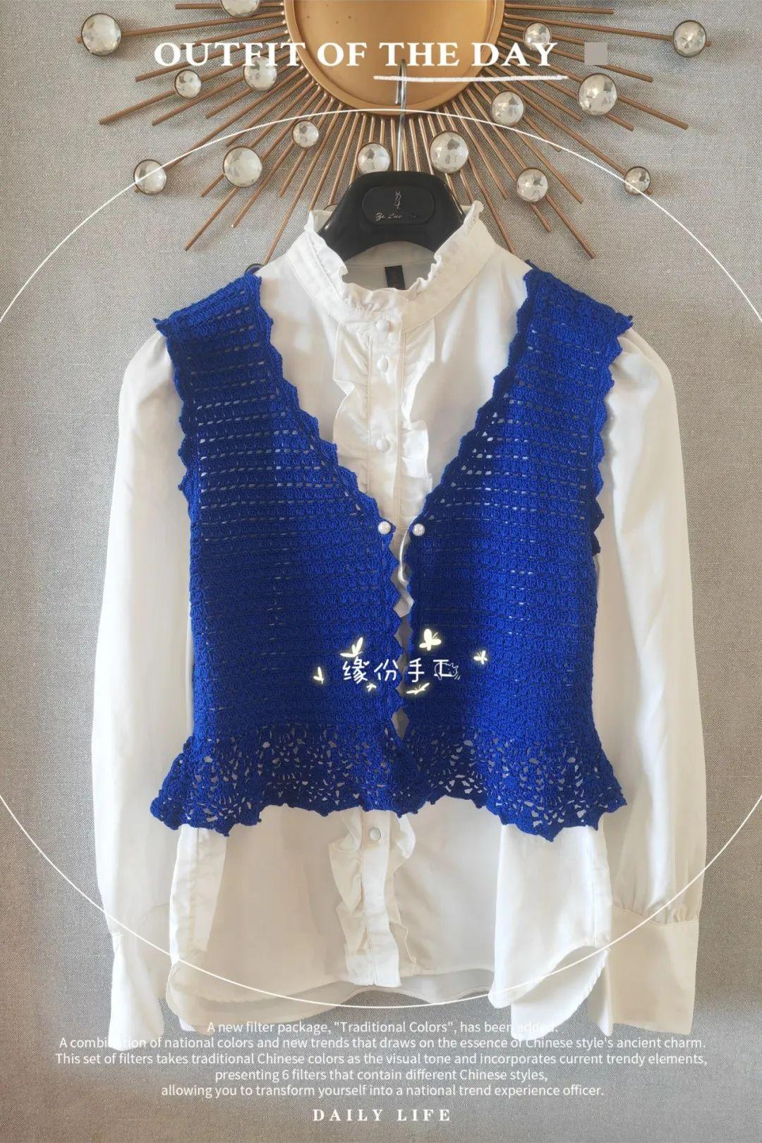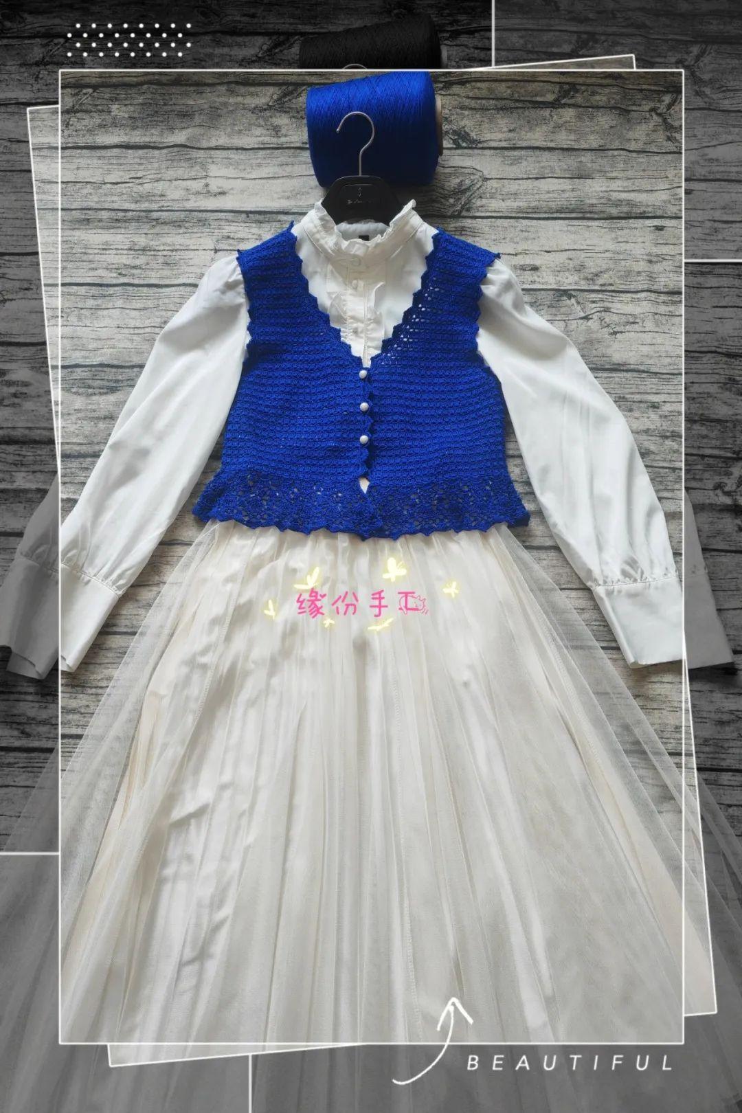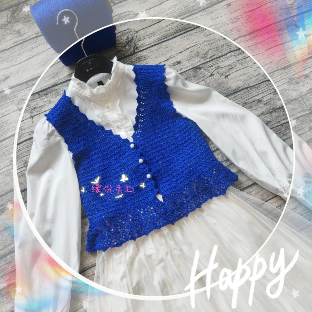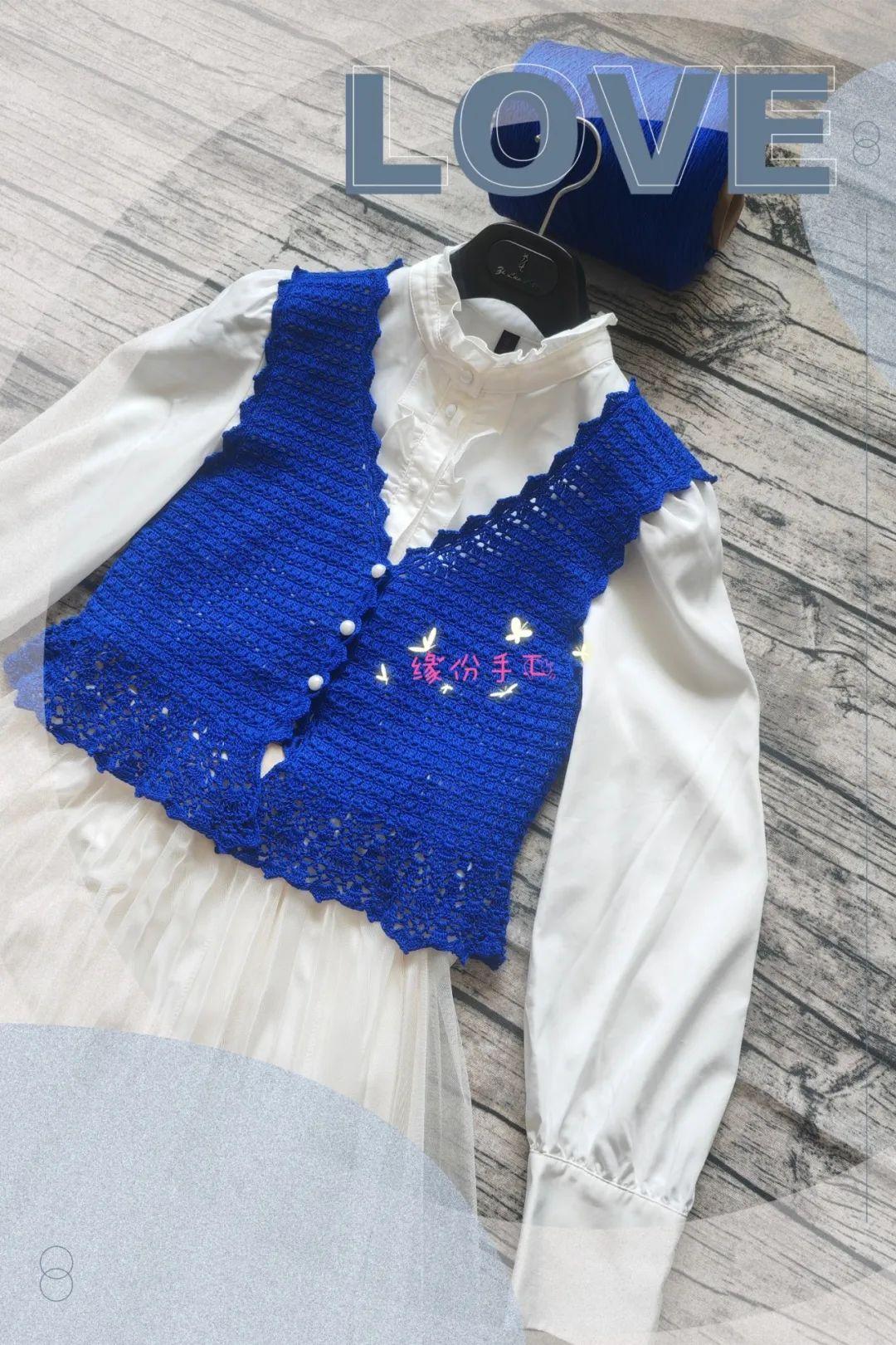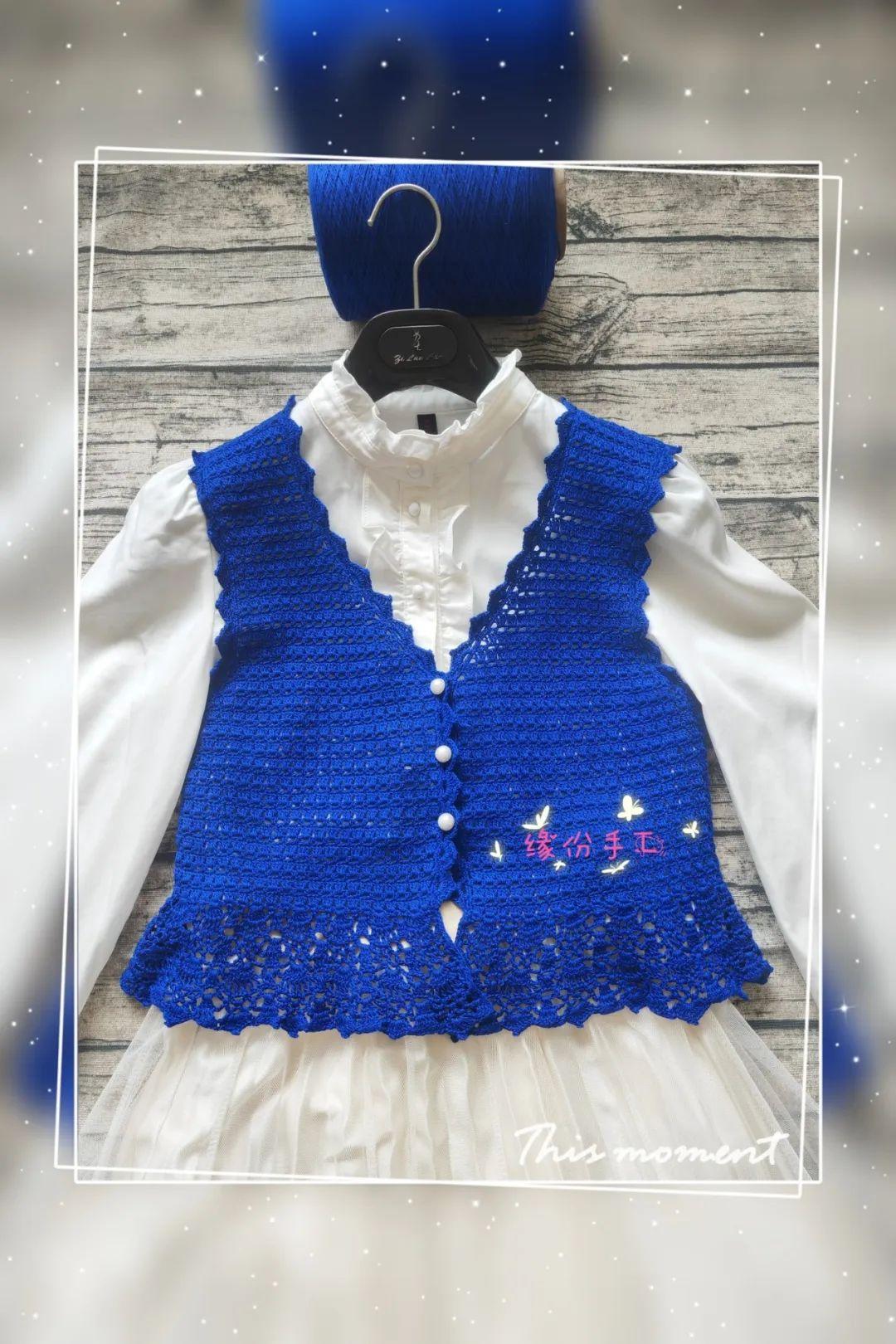 前片:袖笼同后片一样收针,钩完第3组花后开始收前领,每一组花收掉一个花样,余8组花样后不加不减钩与后片一样长。