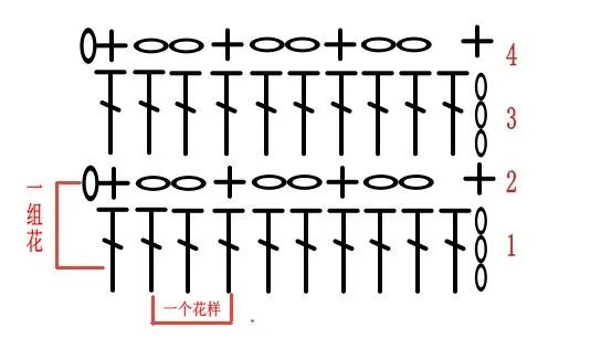 行1-2为一组花,三针为一个花样,不加不减钩完6组花样