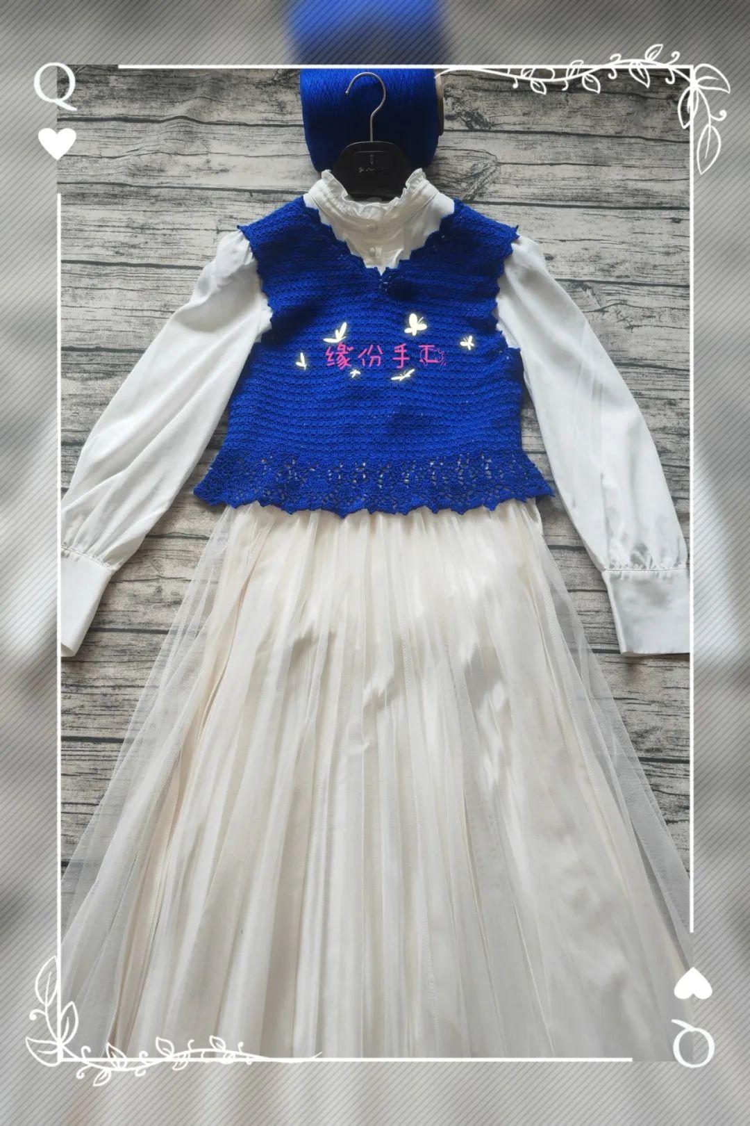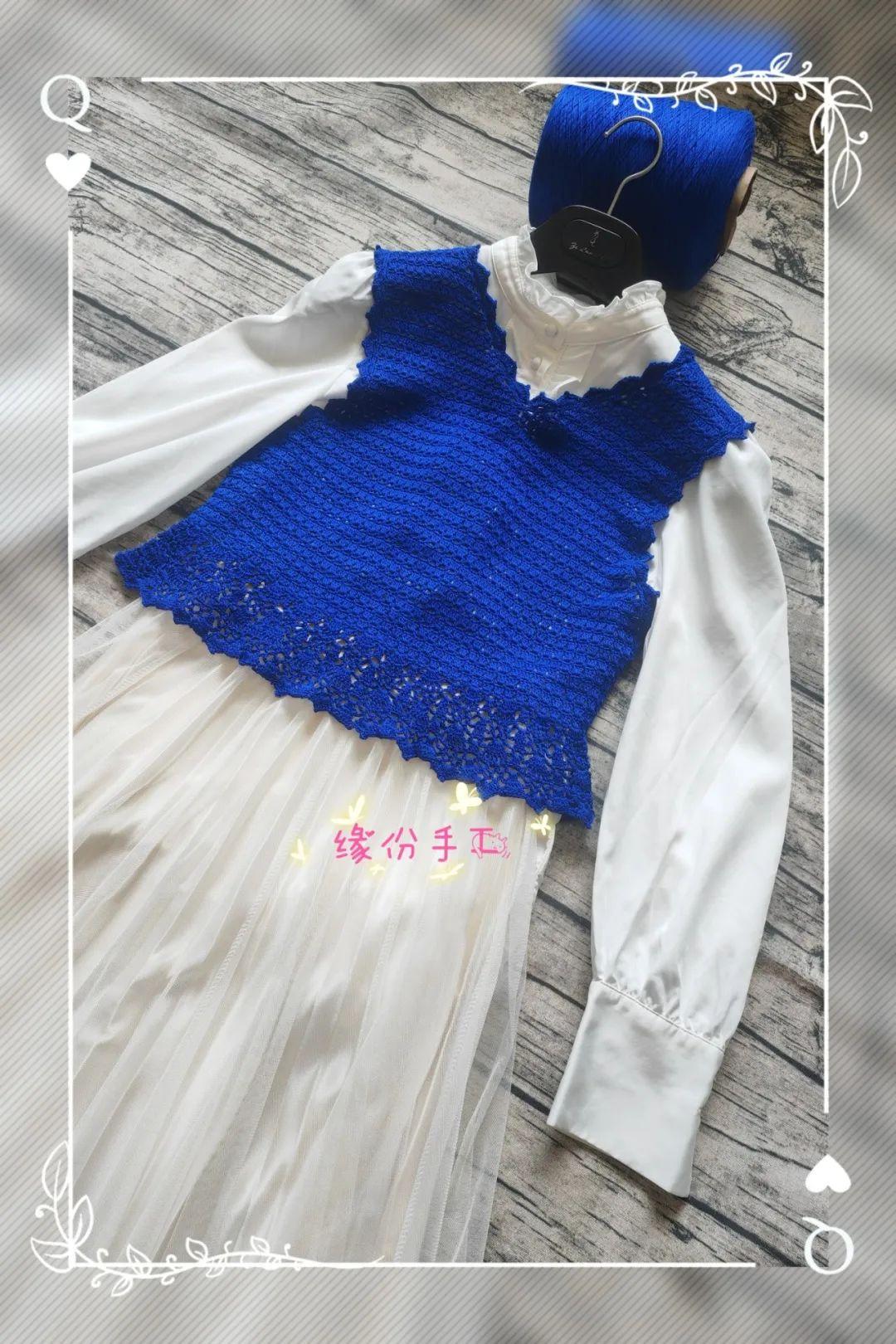 行3:1个网格里钩4长针1狗芽4长针(同底边的花样),下一网格里钩1短针,循环到结束(V领的位置要注意一下,V领中间钩一个网格,在这个网格中里钩短针,两边钩花样,这样才能对称)。