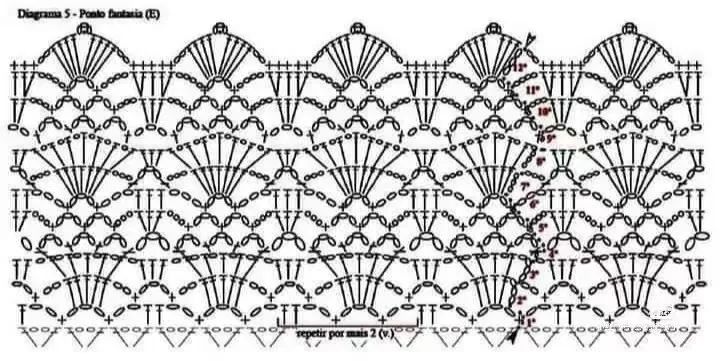 第11组,在三个4长针上钩5个网,,下一行,在增加的5个网里各钩3个长针。(94个花样)