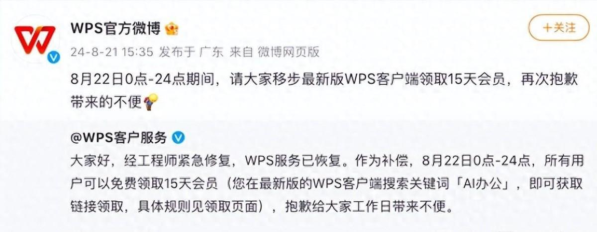 下午,WPS官方的一则声明如同春风化雨,缓解了人们的紧张情绪。他们承诺,在8月22日全天,所有用户都能享受到15天的免费会员服务,作为对此次服务中断的补偿。这一举措,不仅是对用户损失的一种补偿,更是对用户信任的一种重塑。
