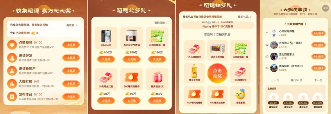 活动期间,快手老铁每天进入“幸福乡村丰收季”页面,完成点赞话题视频、发布话题作品、在三农影响力榜单上为喜爱的创作者投票等互动任务,即可获得不同数量的稻穗,相应数量的稻穗可参与兑换iPhone、现金红包等礼品;与此同时,每人每日还有5次抽奖机会,并可通过稻穗兑换新的抽奖机会,轻松参与抽取万元现金红包等丰收大礼。不仅如此,活动结束后,三农影响力榜单上排名第一的创作者还将获得6666元现金奖励。