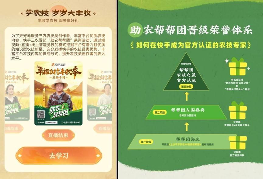 为更好地服务农技创作者,同时丰富农技内容供给形式,今年春耕季期间,快手又创新推出农技直播节目《助农帮帮团》,邀请多位农技专家来到直播间,通过“短视频+直播+线上答题竞技”模式,为农民老铁答疑解惑。丰收季期间,《助农帮帮团》也再次升级,增加了晋级荣誉体系,活动将挖掘有潜力且优质的知识型农技新星,并通过官方资源倾斜助力更多农技创作者建立“以技带物”的经营模式,实现农技推广的可持续发展。