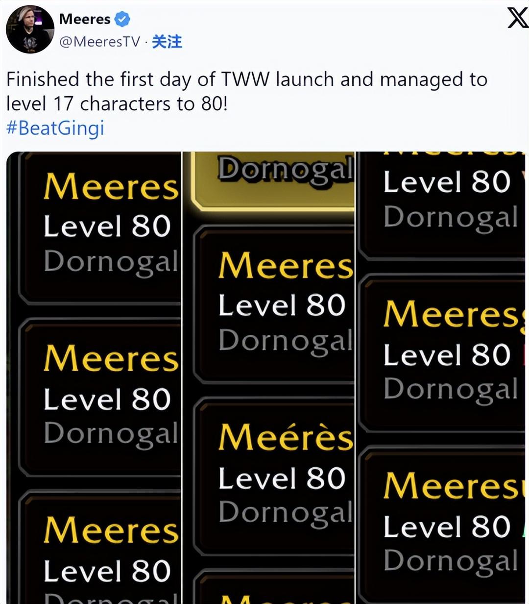 从Meeres分享的截图来看,他只用了差不多一天的时间就把账号下17个角色全都练到了满级,为即将到来的世界团本首杀做好了准备。至于为何他能在如此之短的时间内练满17个满级账号,主要还是因为公会成员的给力支持,让他第一个角色只花了1个多小时就推完了主线,为后面小号的练级提供了方便。